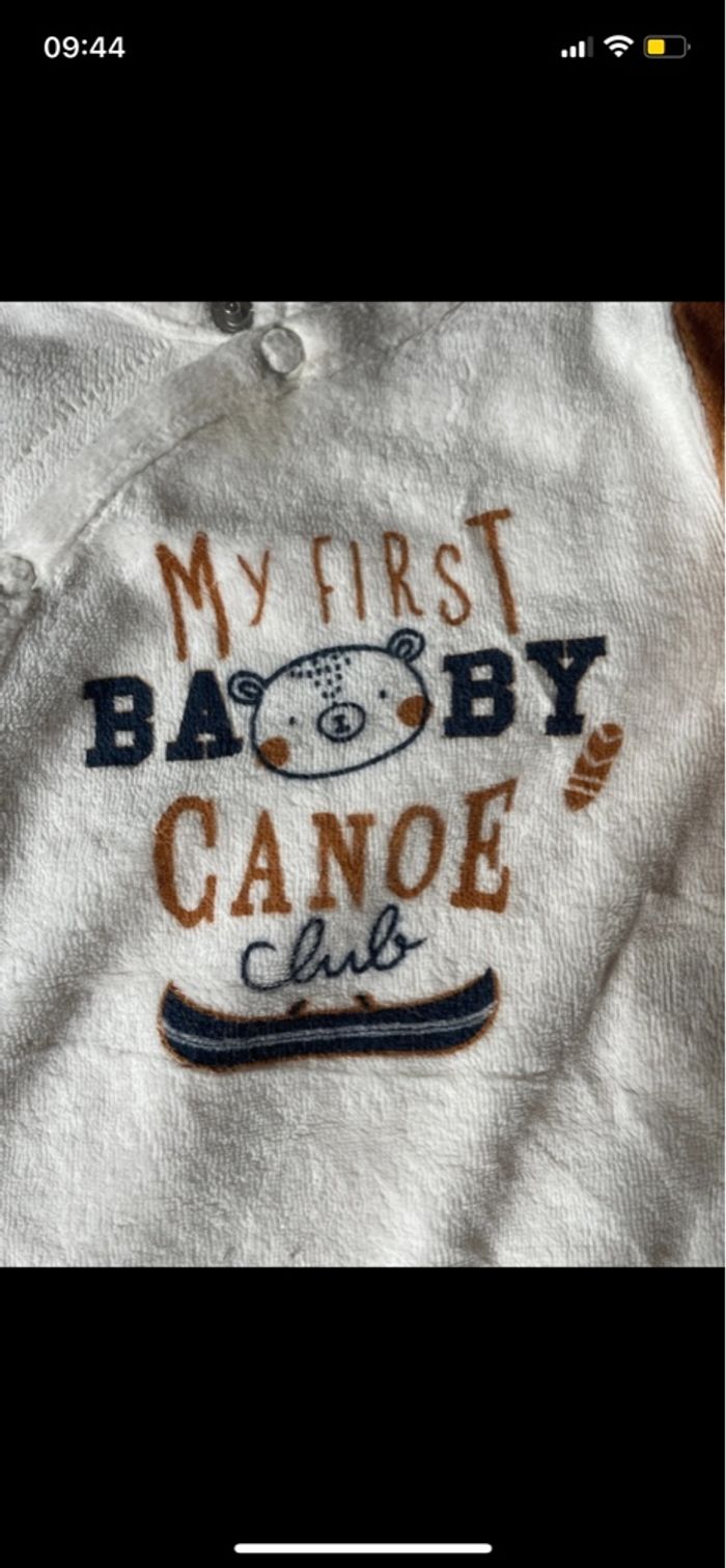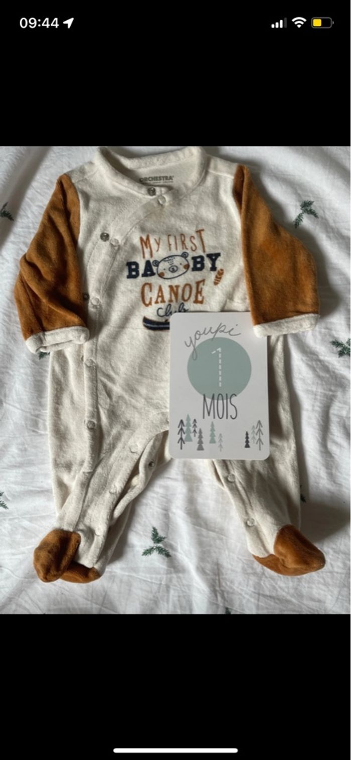 Pyjama ouverture à l’avant - chaud hiver velours Thème : marron beige camel canoë ours 🐻 📏 taille : 1 mois 54 cm 🛍️ marque : orchestra 🗒️ état : très bon état - ni tache ni trou Dessins légèrement craquelés Maison non fumeur, sans animaux. Lessive clean 🍃