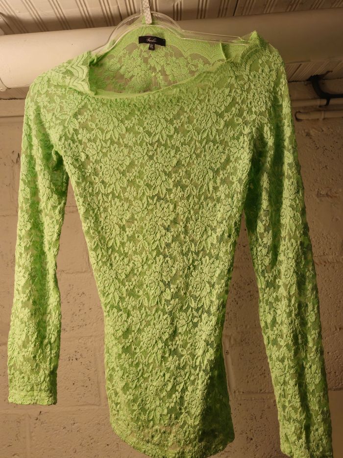 Haut en dentelle vert pomme, porté une fois pour shooting. Taille plutot M. A porté sous une veste