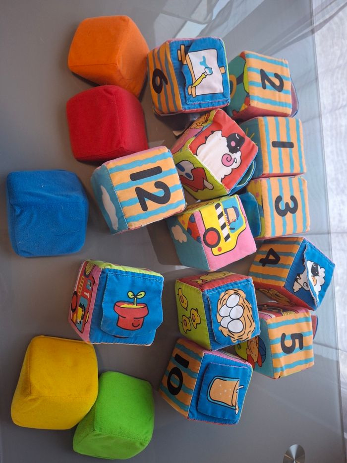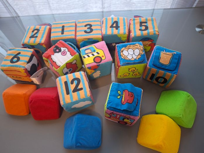 Lot de 13 cubes de jeu tissu multifaces avec 5 triangles. Le tout est en bon état juste à nettoyer