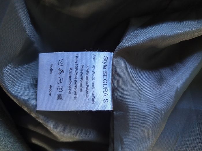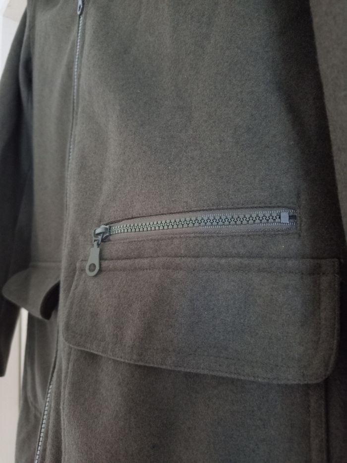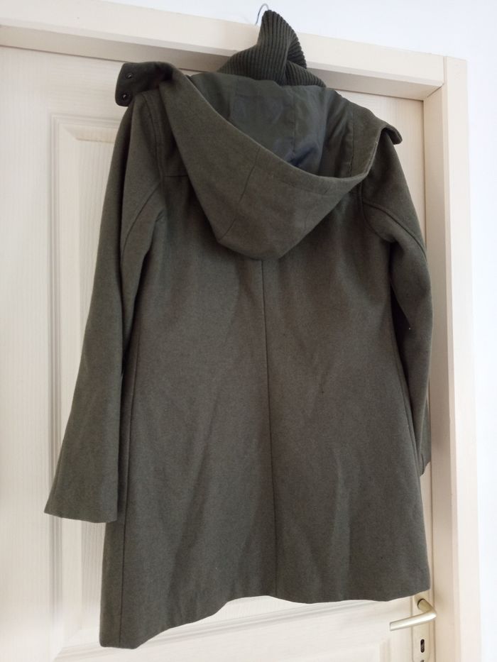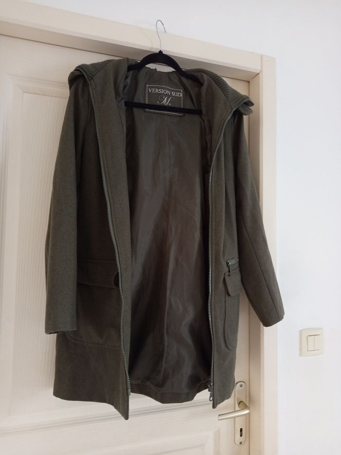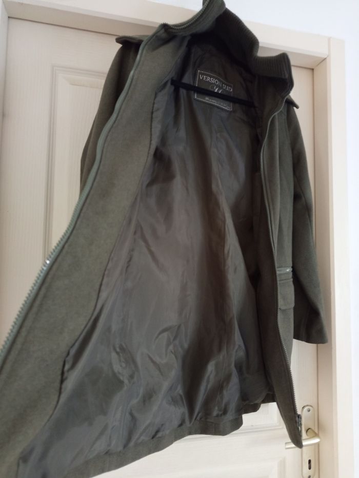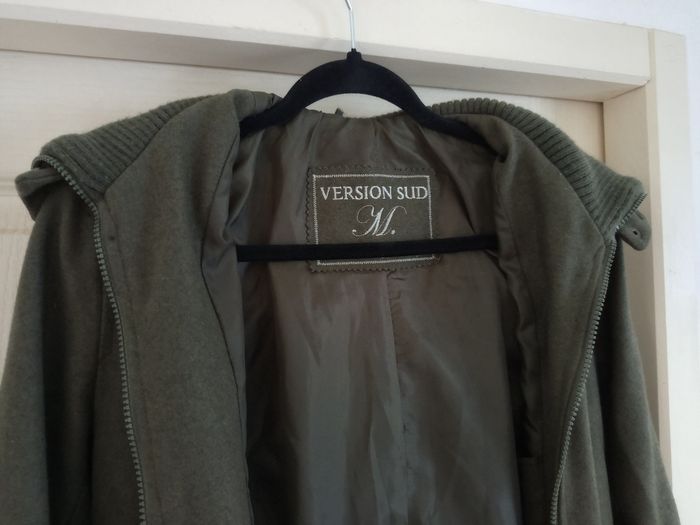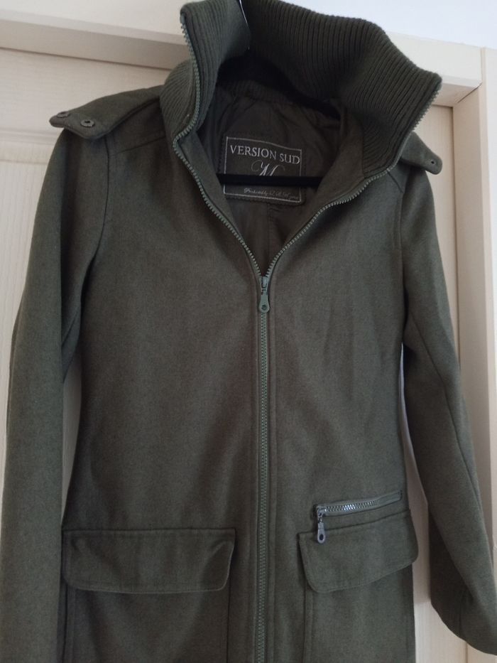 Manteau duffle-coat droit, kaki, de très bonne qualité, 70% laine, avec capuche, col rabattable ou montant, en fonction du froid, 3 poches extérieures, une poche intérieure. Zip. Taille S. Marque Version Sud En excellent état, comme neuf. Très peu porté Dimensions : - 38 cm aux épaules - 44 cm aux aisselles - 61 cm longueur de manche - 80 cm depuis l'épaule jusqu'au bas
