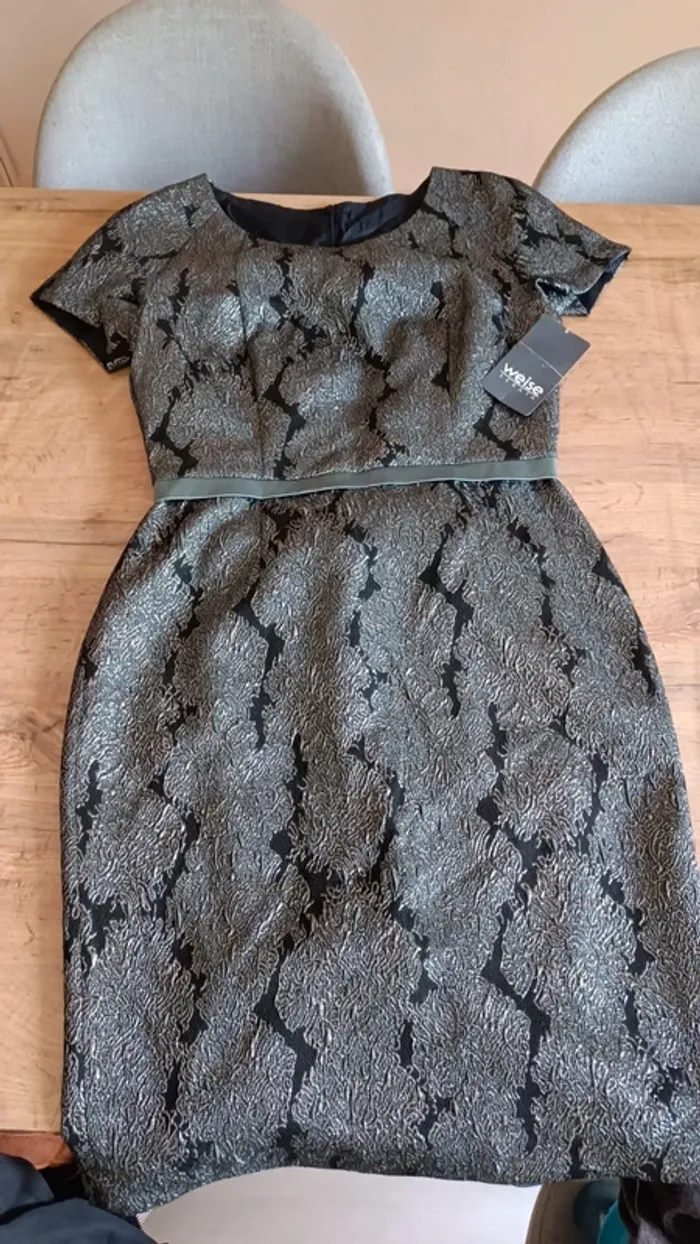 Robe de soirée argenté et noir. Avec fermeture éclair dans le dos, cintrée à la taille. Neuve avec étiquette