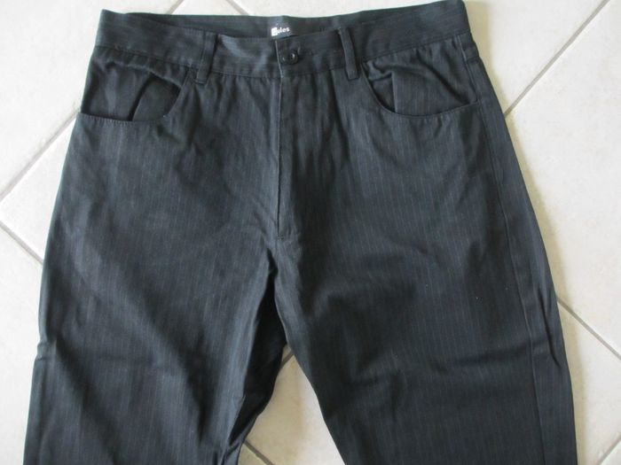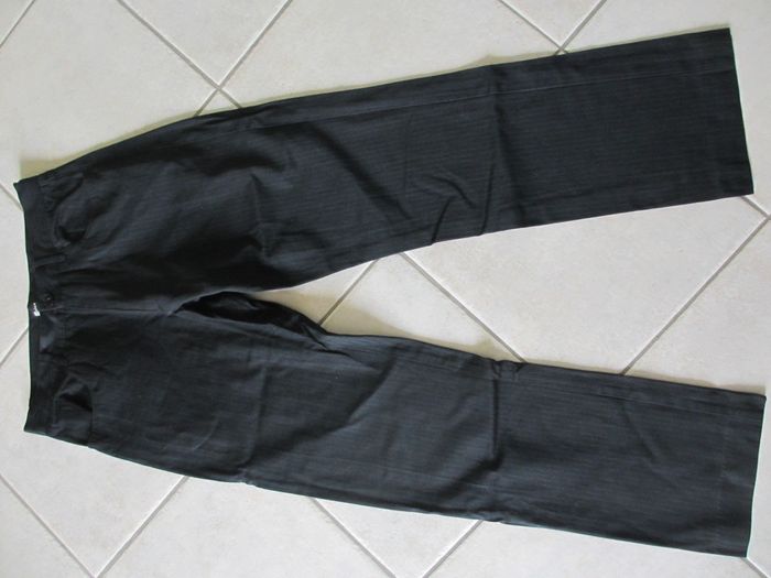 Pantalon noir à fines rayures homme Jules – Taille 40 Coupe droite. Entrejambe : 77 cm. Largeur taille : 40 cm. Largeur cheville : 21 cm. A porter comme pantalon classique ou à associer avec une veste de costume. Composition : 45 % coton, 35 % polyester, 20 % viscose. Très bon état (porté 2 fois).