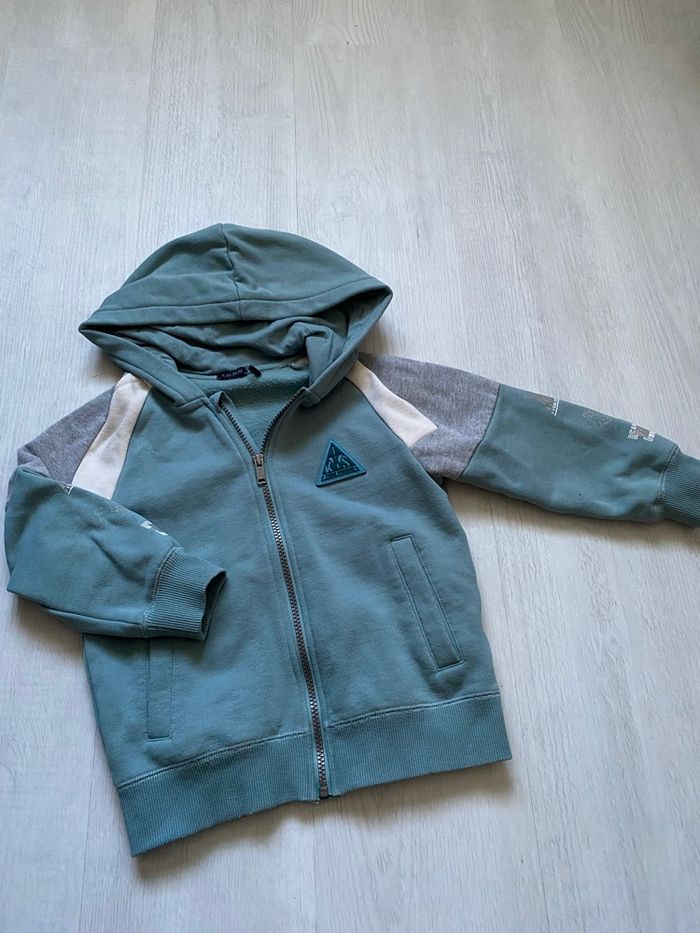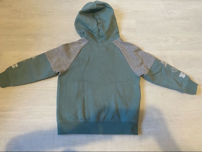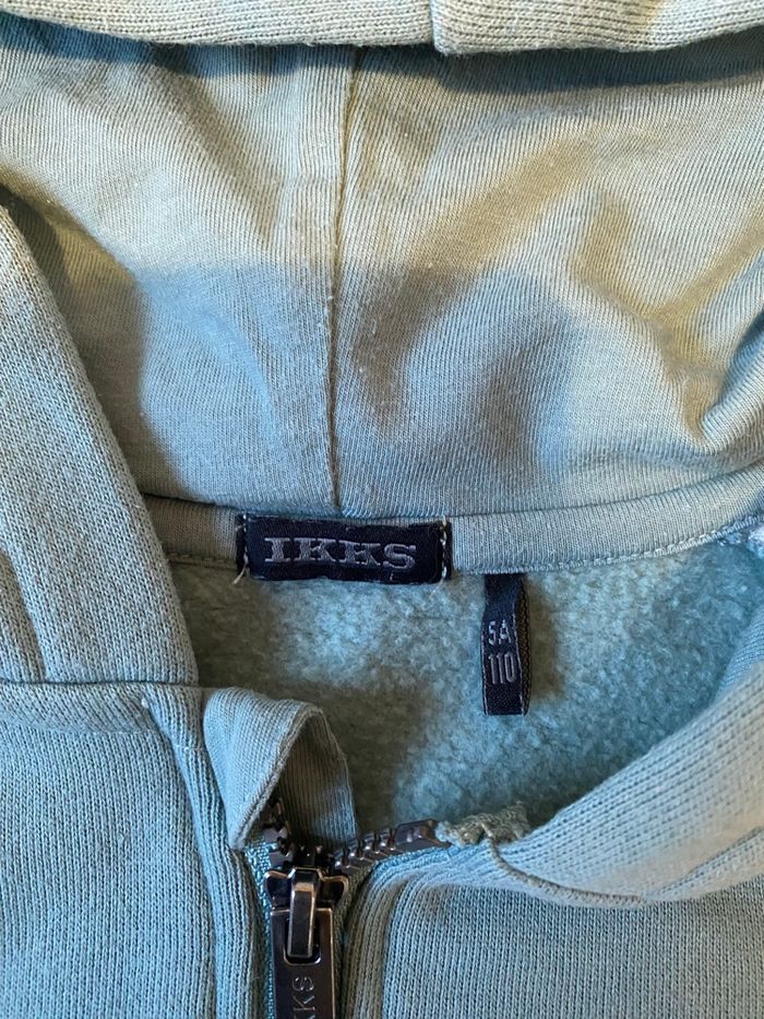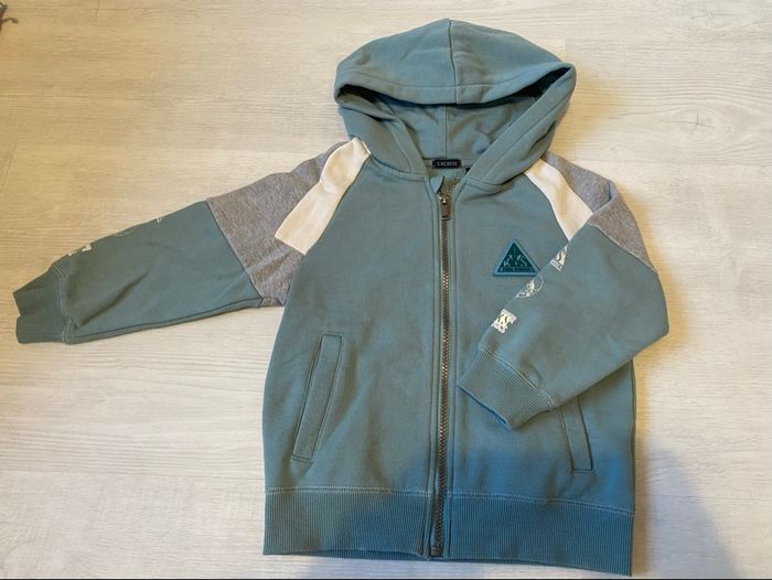 Sweat zippé à capuche ikks 5 ans Deux petits défauts : petite tache de colle manche droite et légèrement décoloré en haut derrière sur 2 cm, cf photo.