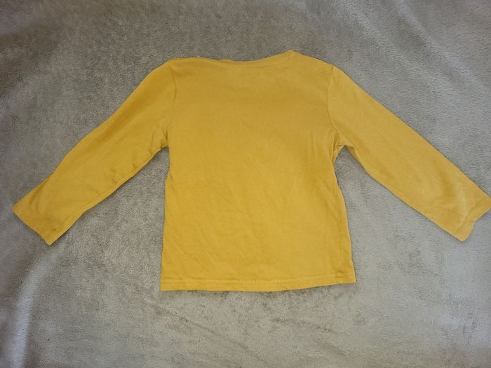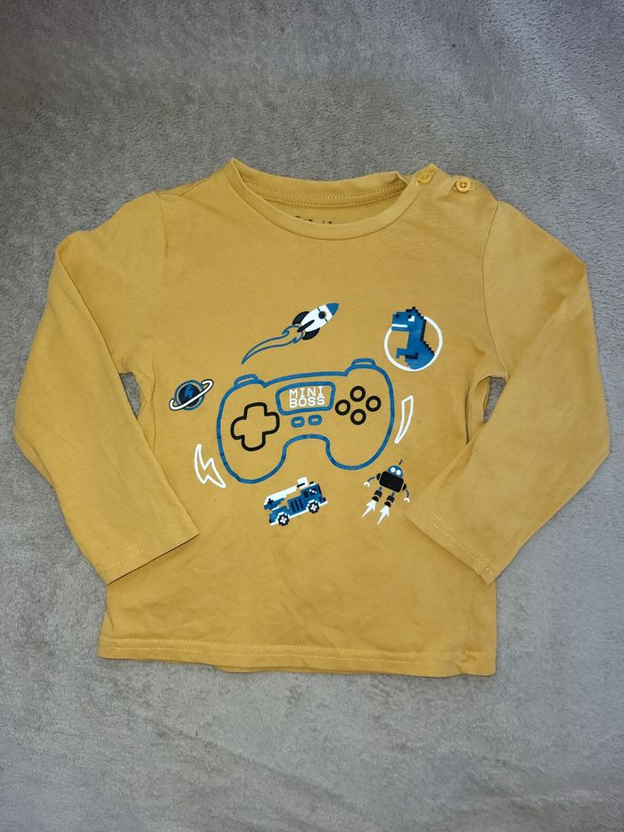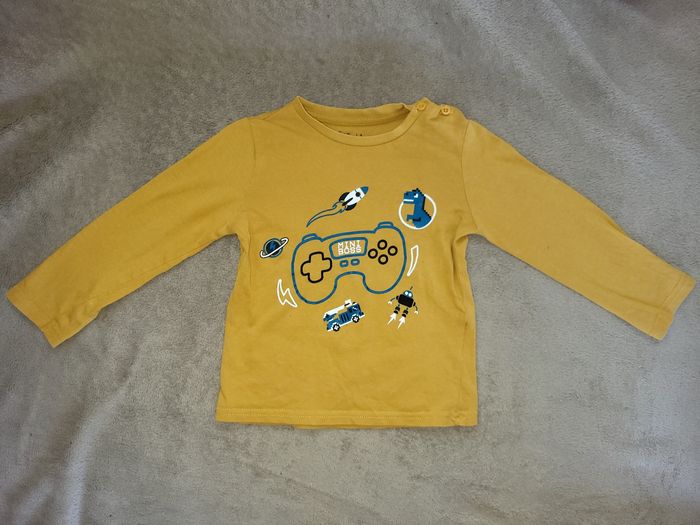 T-shirt manches longues moutarde Gémo "Mini boss" Motifs manette de jeu, fusée, dinosaure, robot, camion de pompier, planète 2 - 3 petites tâches discrètes #virgy61garcon3ans