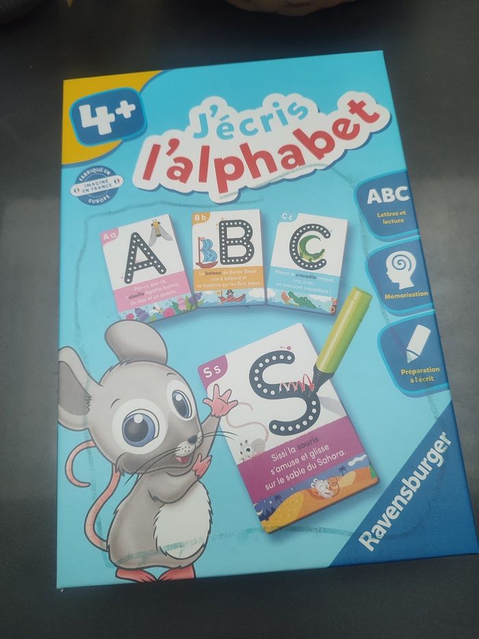 J'écris l'alphabet permet a l'enfant d'apprendre à écrire les lettres Comprend 26 fiches correspondant chacune à une lettre de l'alphabet et un crayon qui fonctionne Jeu en bon état, juste ma fille a écrit sur la boîte et quelques fiches (voir photos)