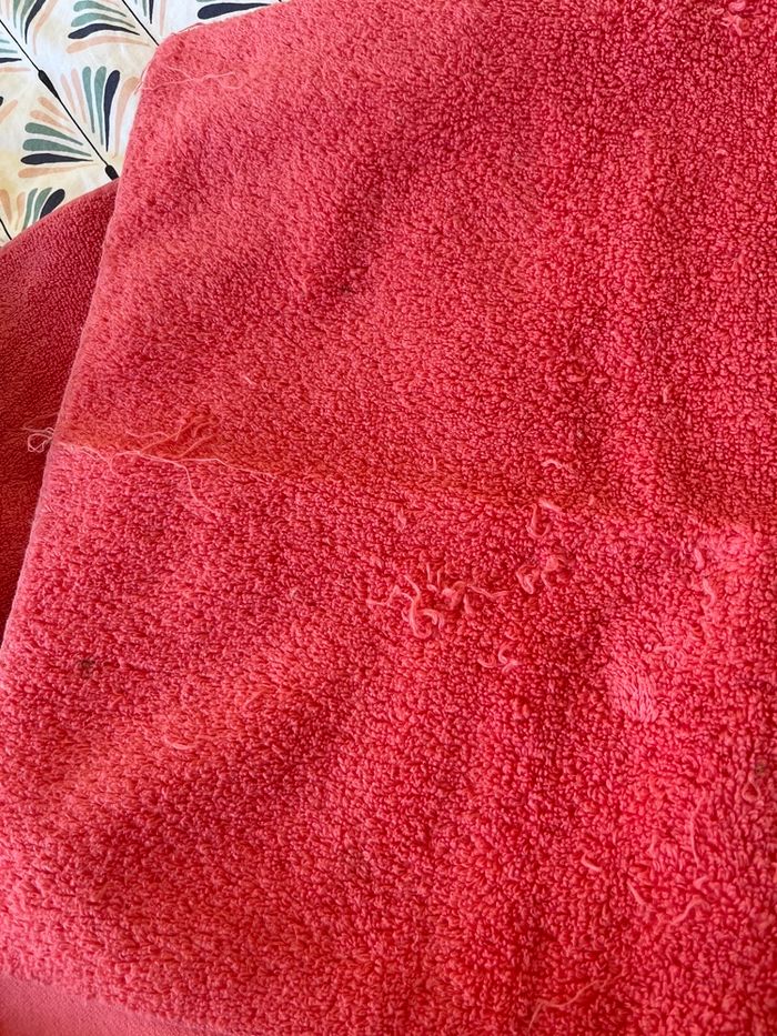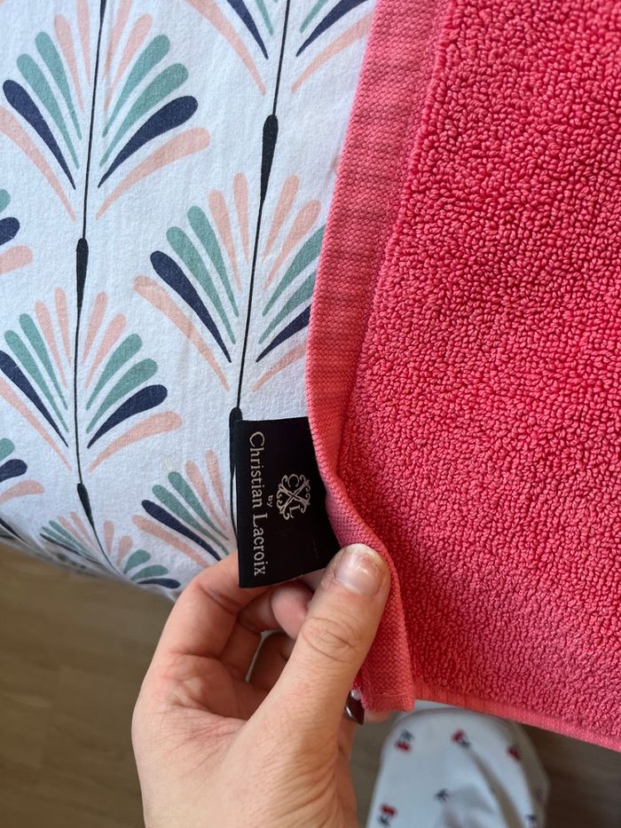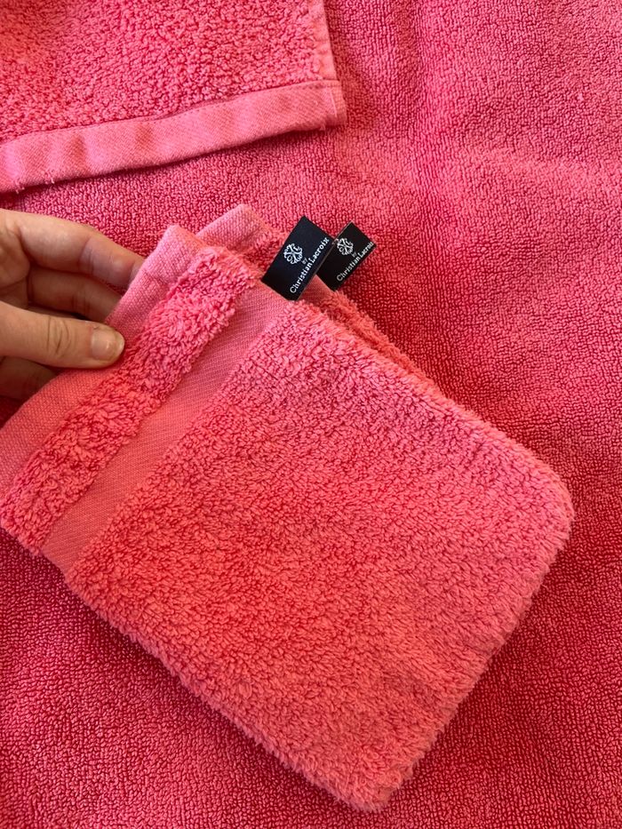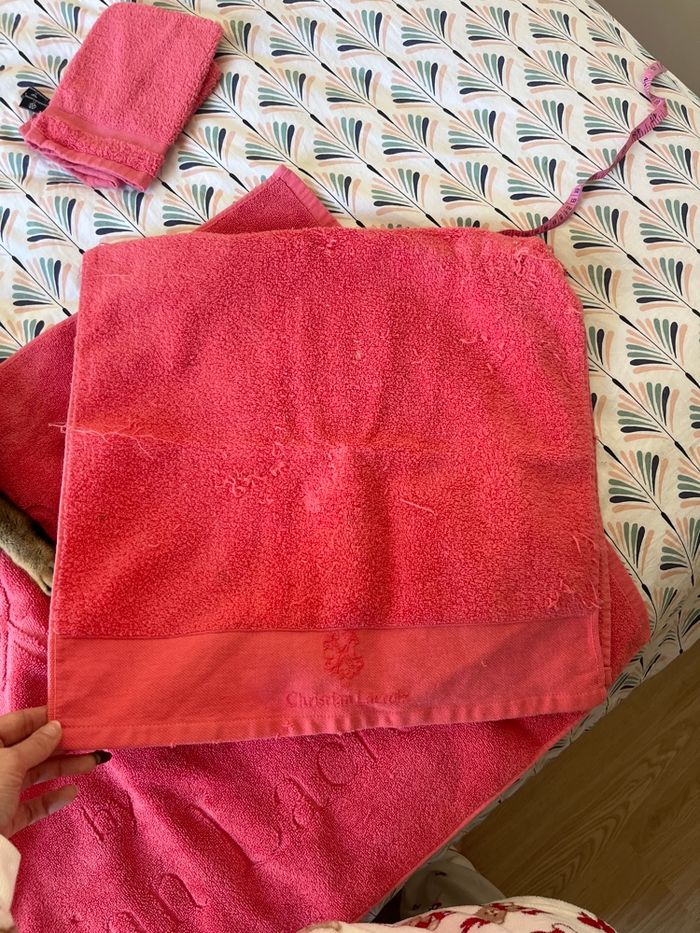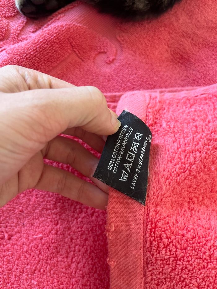 Lot de linge pour la salle de bain comprenant - une serviette de douche (91,5cm x 48cm) - un tapis de bain (96cm x 60cm) - 2 gants de toilettes Le tout en rose 100% coton !!! Les gants sont en super état jamais utilisés. Le tapis de bain ainsi que la serviette de douche ont été visité par mon lapin 😅 il y a donc des endroits qui ont été légèrement grignotés ainsi que des fils. Mais restent en bon état d’utilisation ! Marque : Christian Lacroix