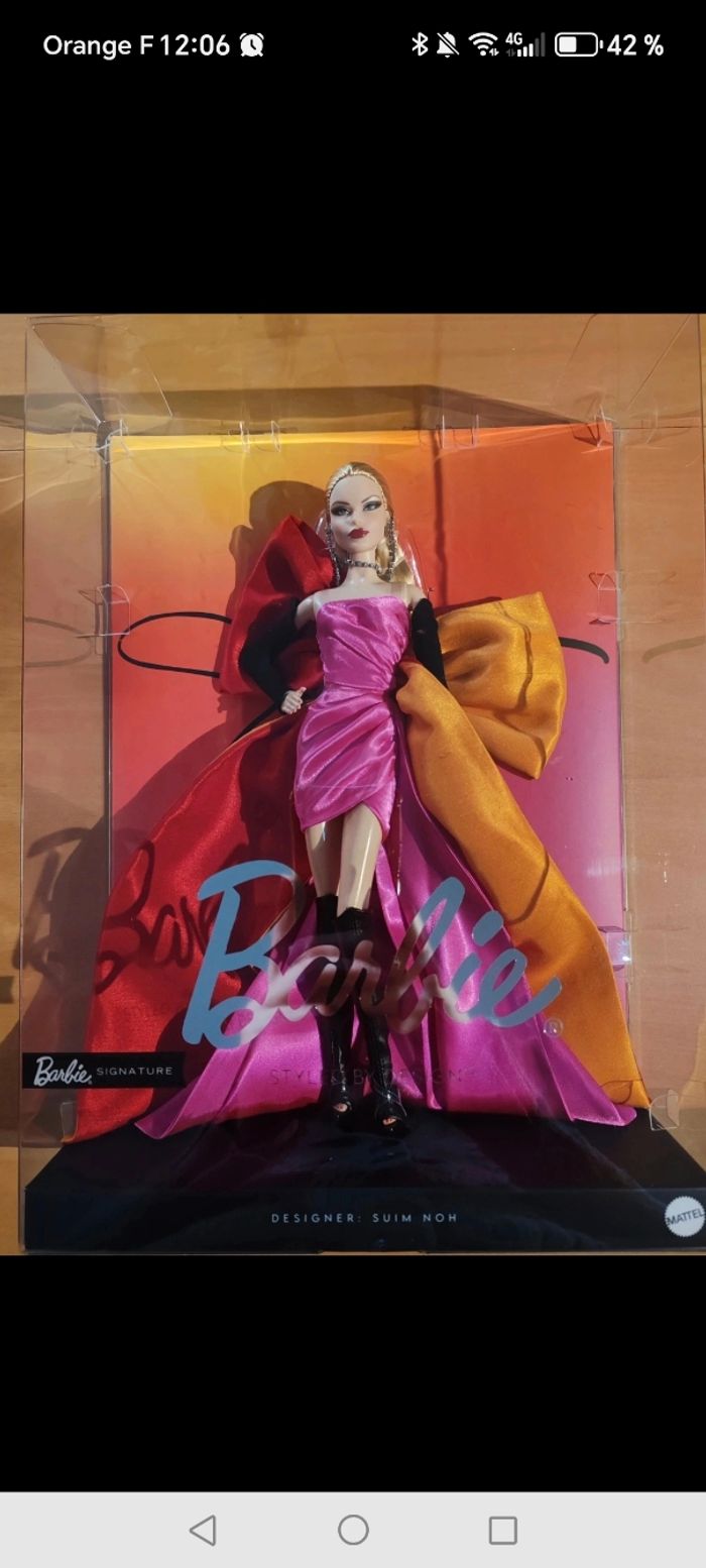 ✨ Première poupée de la prestigieuse série Styled by Design, créée par la designer Suim Noh. - État : neuve, jamais ouverte, boîte scellée. - Édition Gold Label Mattel Signature (2024), vendue exclusivement en ligne. - Tenue couture : robe satin rose vif avec nœud oversize rouge-orange, gants noirs, maquillage stylisé. - Packaging premium : boîte transparente avec fond dégradé orange-rose, idéale pour exposition. 💎 Rare sur le marché européen dans cet état impeccable. 🎁 Parfaite pour les collectionneurs Barbie Signature, amateurs de mode et passionnés de poupées de collection. #BarbieSignature #StyledByDesign #GoldLabel #SuimNoh #BarbieCollector #Barbie2024 #FashionDoll #CollectorDoll #EuropeSale