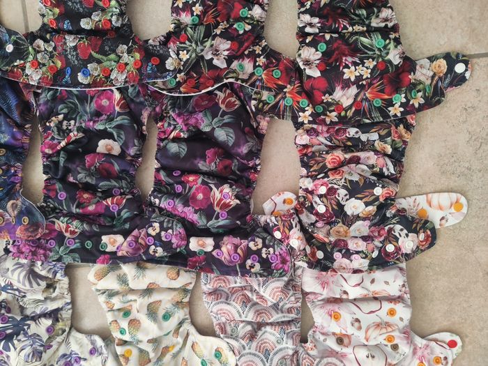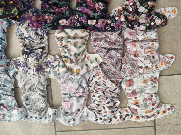 Lot de 23 couches lavables à poche de la marque Rasppies fermeture pression. Intérieur coolmax. Taille 6-16 kg. Photos individuelles sur demande. Couches entretenues selon les routines du groupe Facebook des CLVA, 2 cycles longs avec lessive compatible (routine validée sur le groupe).