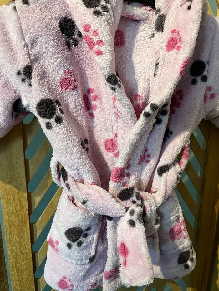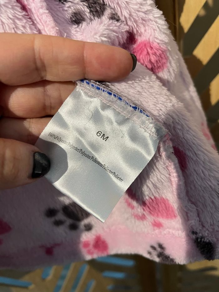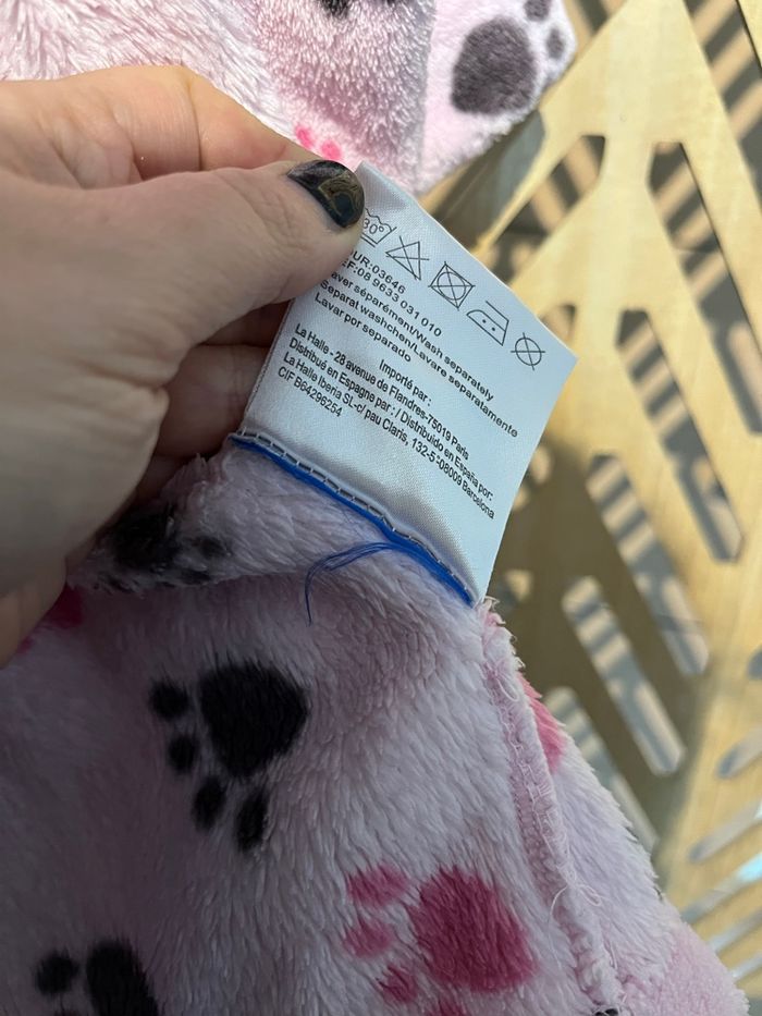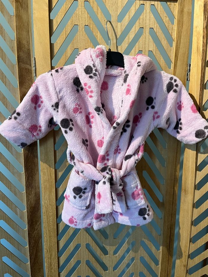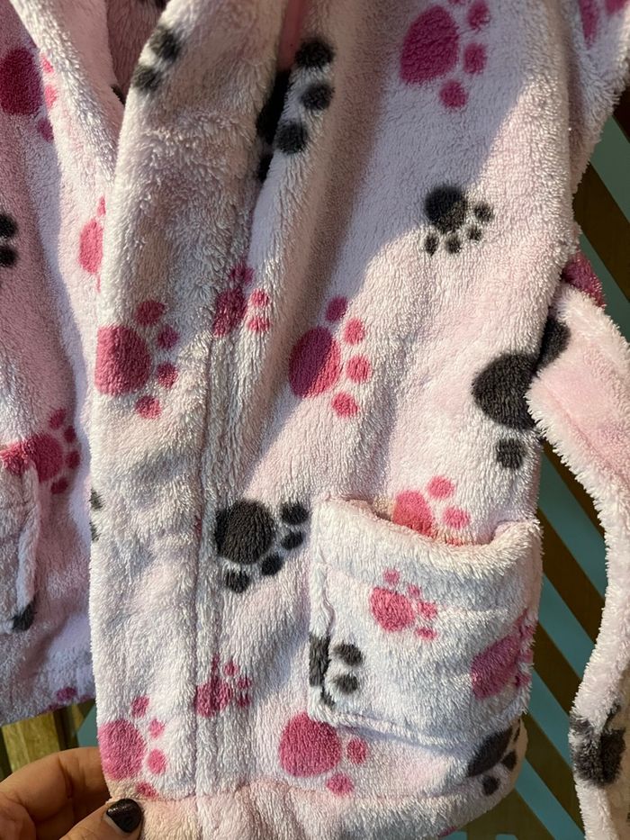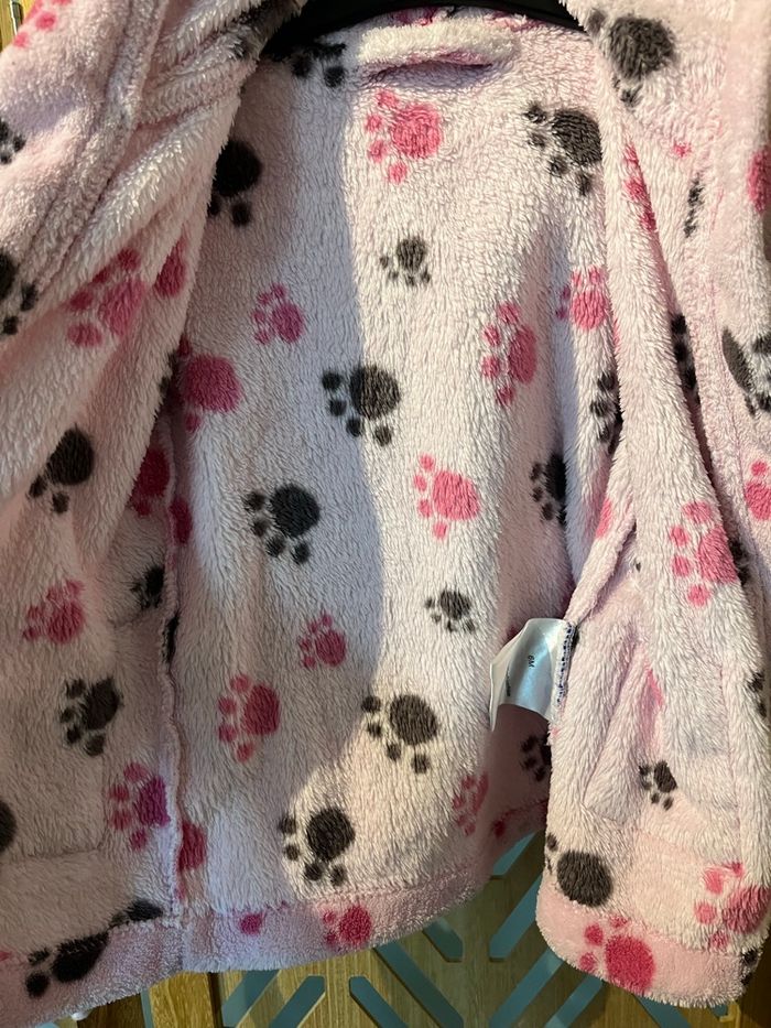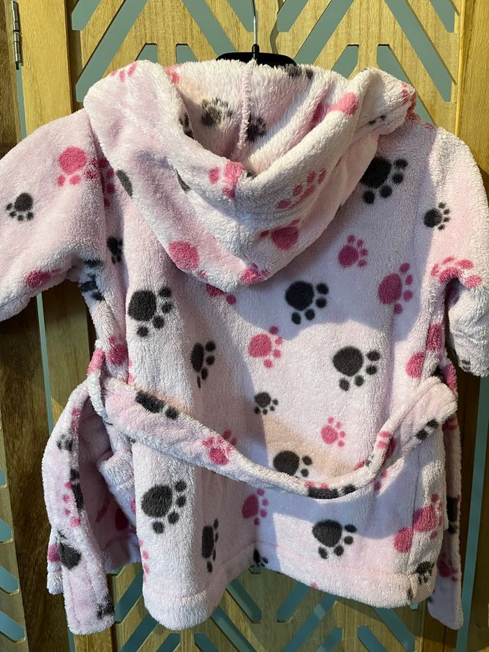 Jolie peignoir / robe de chambre Bien chaude en matière plaid Bébé fille 6 mois , La Halle Rose avec des pattes de chat rose et noir 🐾 Capuche , poches et ceinture Idéal pour les matins d’hiver ☺️