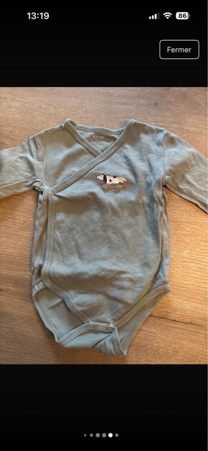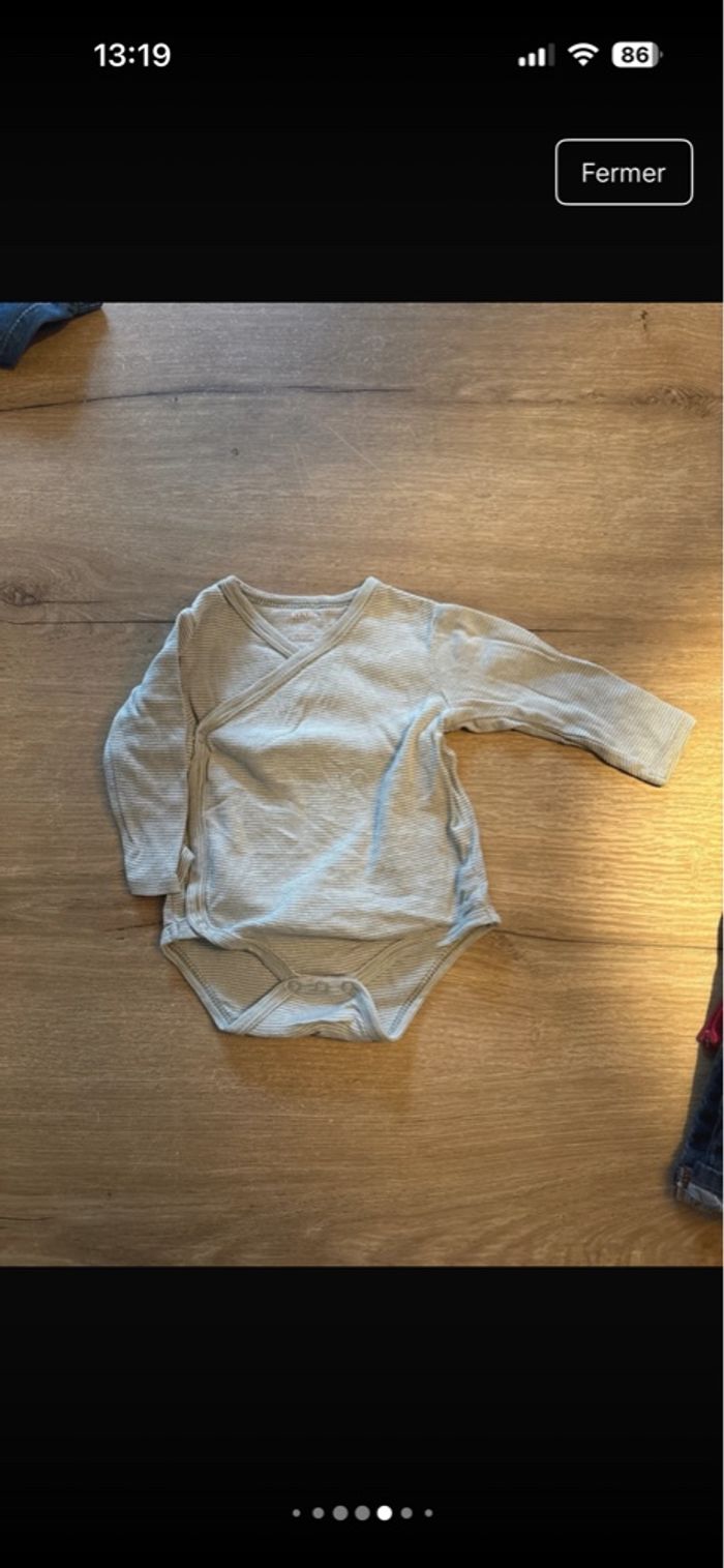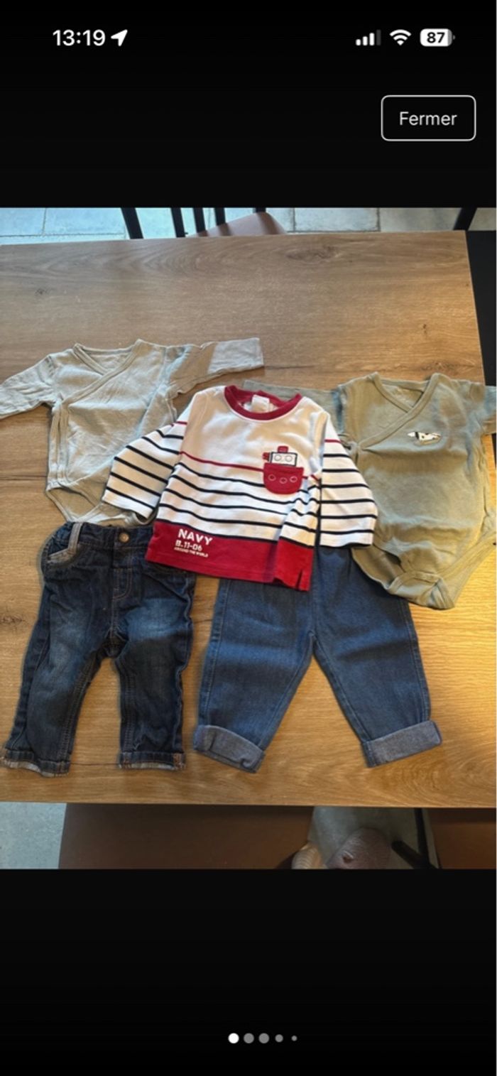 Lot de 2 pantalons, 2 bodys manches longues et un pull Taille 6 mois Le dessin se décolle sur un body (dernière photo) D’autre lots disponibles
