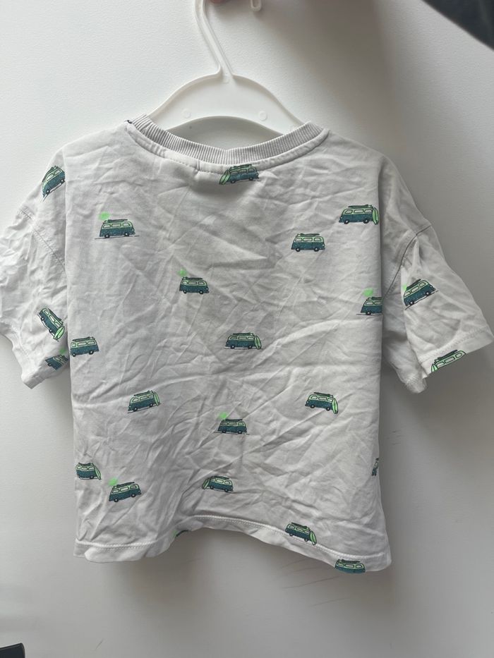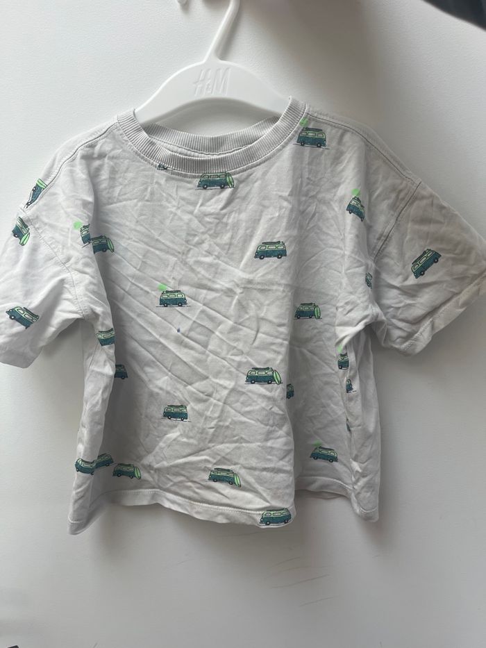 T-shirt Zara blanc avec un road surfeur bleu et vert. Bien entretenue dans l’ensemble avec une toute petite tache bleu.
