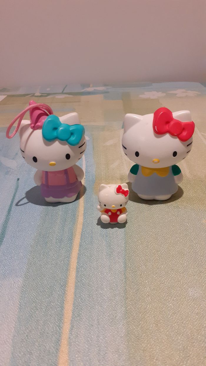 Vends un lot de 2 figurines Hello Kitty, hauteurs 8 et 9 cm + une miniature 4 cm.