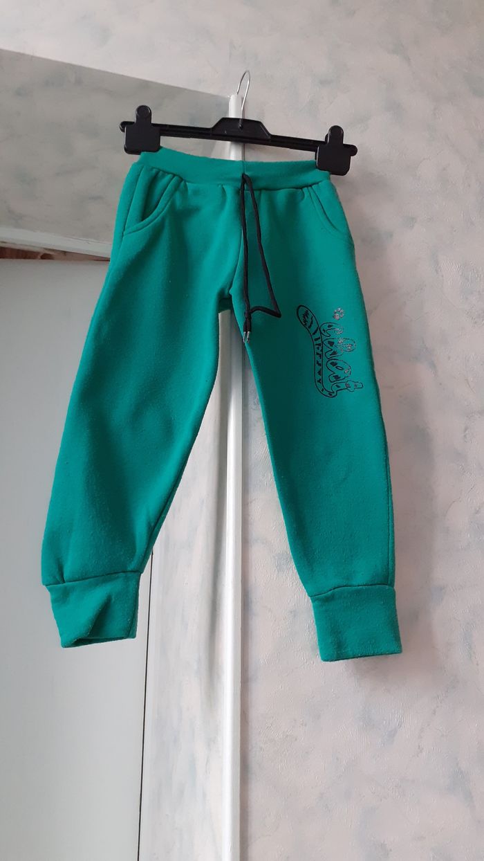 Vends un bas de jogging molletonné, 2 poches, couleur vert avec un lien noir, un chat en motif sur une jambe, taille 8 sur l'étiquette mais il est court, 7 ans. Longueur entrejambe : 46 cm.