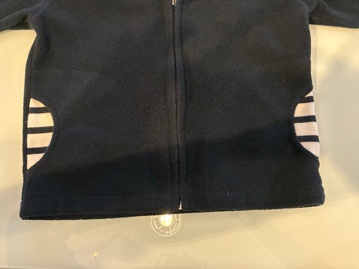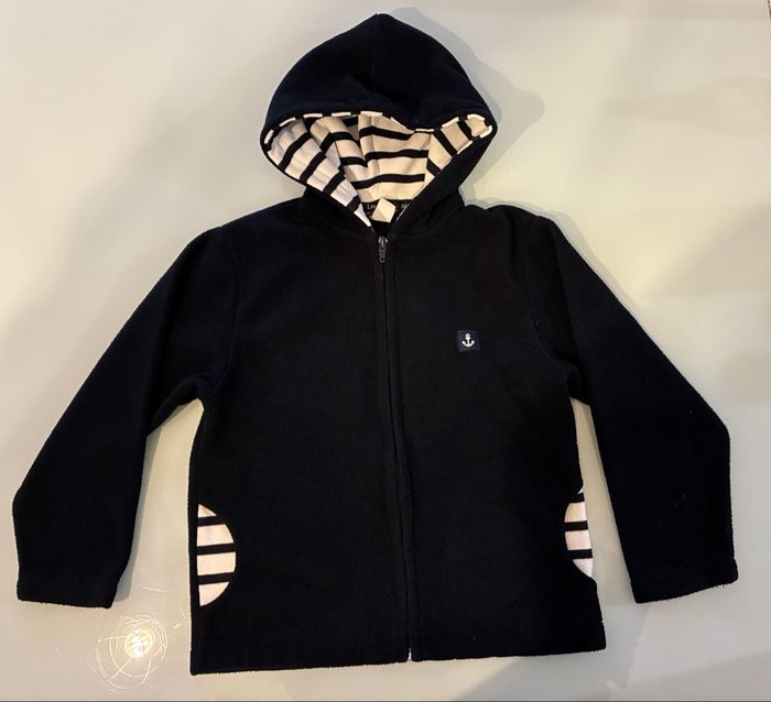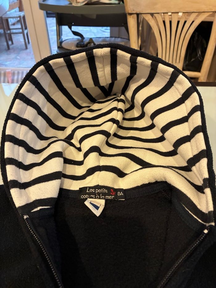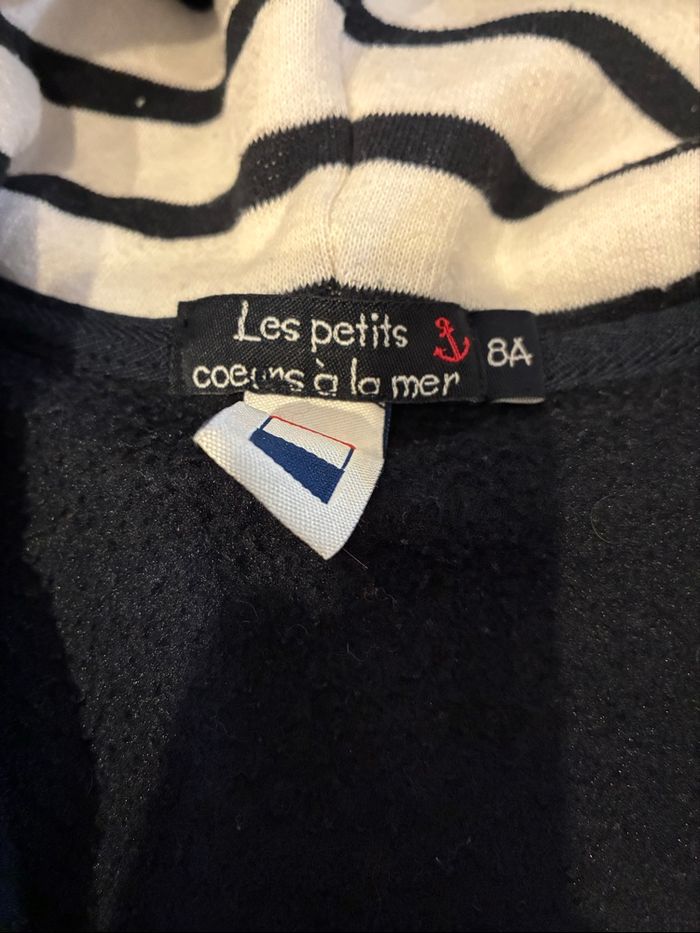 Adorable veste marine style marin, taille 8 ans, de la marque Les Petits Cœurs de la Mer. 100% polyester, douce et chaude, parfaite pour la mi-saison ou les soirées fraîches. Capuche doublée avec joli motif rayé blanc/marine, rappel également sur les poches. Fermeture zipée, en très bon état. ✔ Doublure rayée style bord de mer ✔ Capuche confortable ✔ Idéale pour l’école ou les balades ✔ Aucune tache / Aucun défaut 📏 Taille : 8 ans 🧵 Composition : 100% polyester