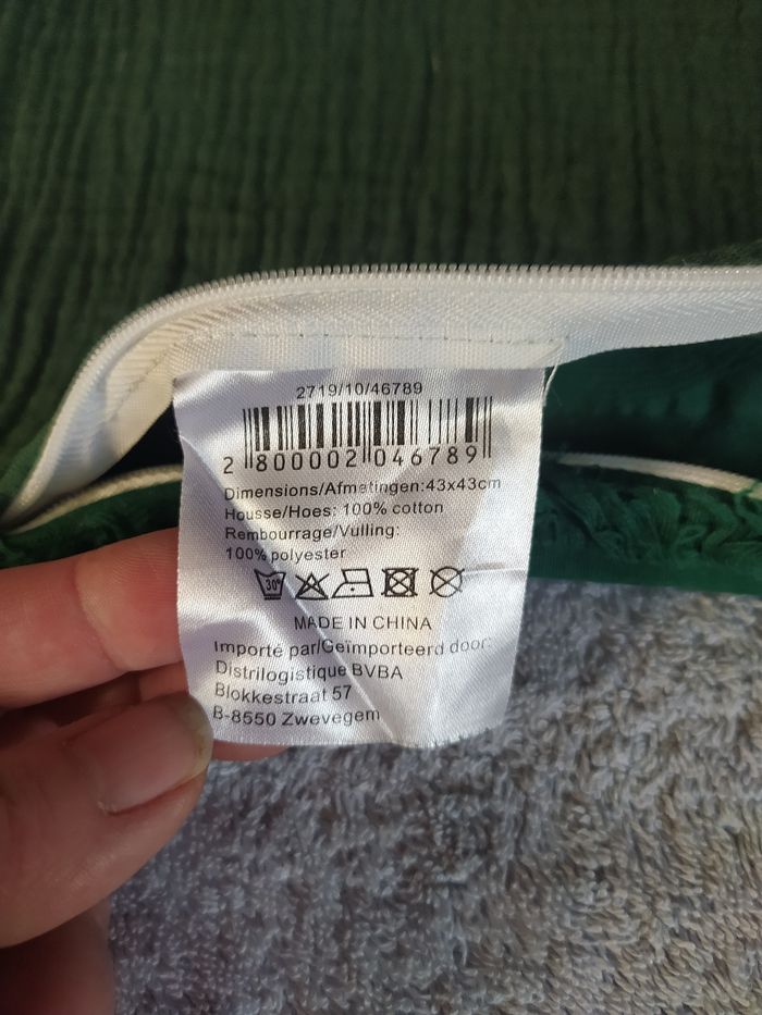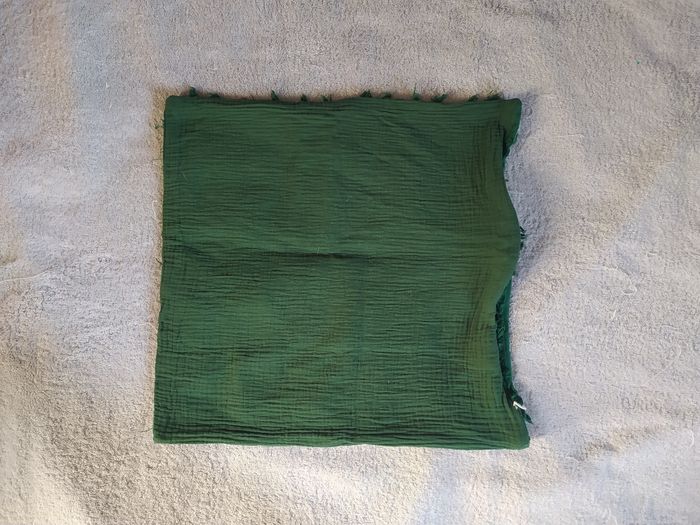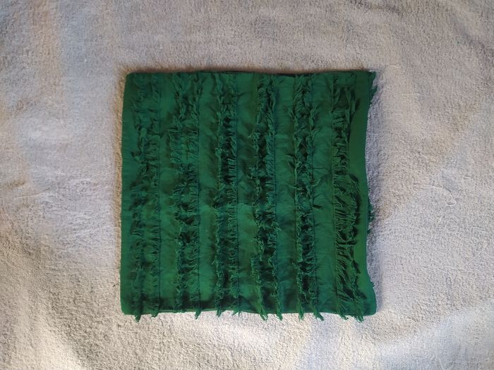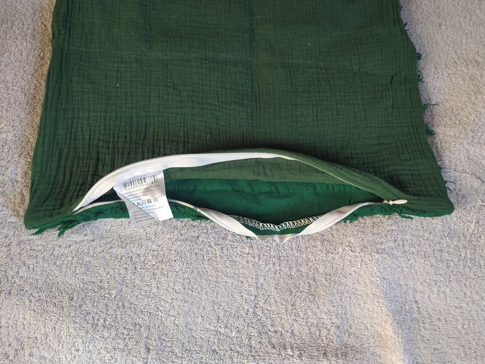 ⚠️envoi à partir de 5€ d'achat⚠️ Housse de coussin couleur: Vert sapin pour coussin de 40x40 cm en coton une face avec de petites franges, une face en coton de gaz, 1 grande ferme éclair, dimensions: 43x43 cm importé par un distributeur belge Excellent état ⚠️ envoi à partir de 5€ d'achat⚠️