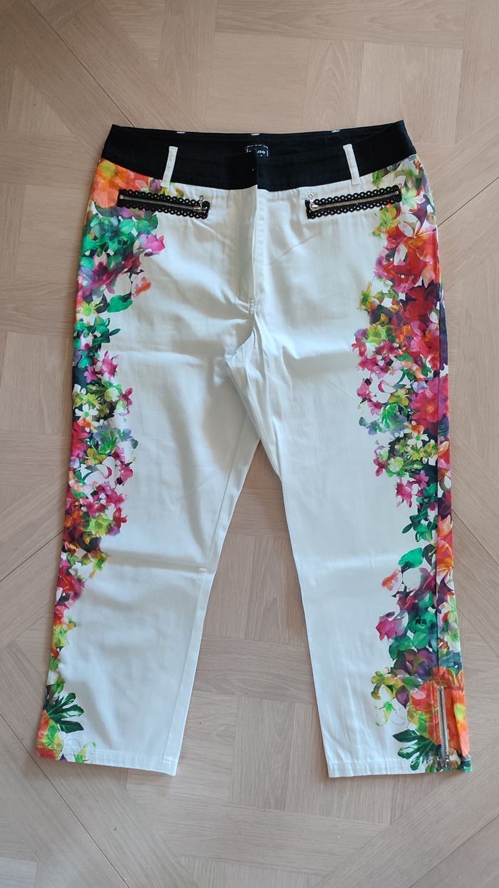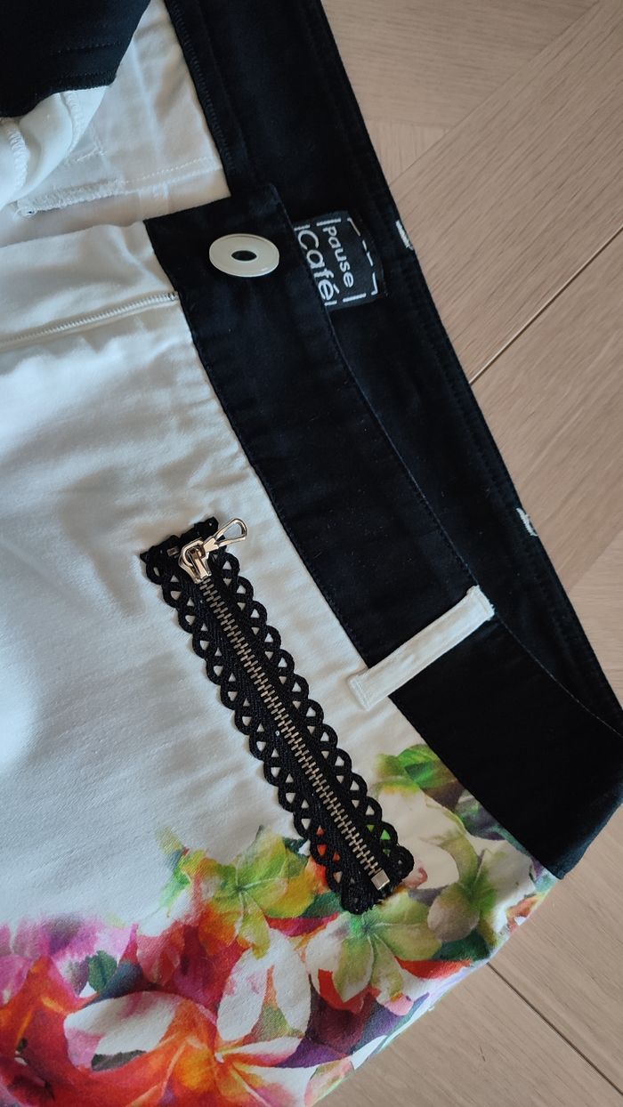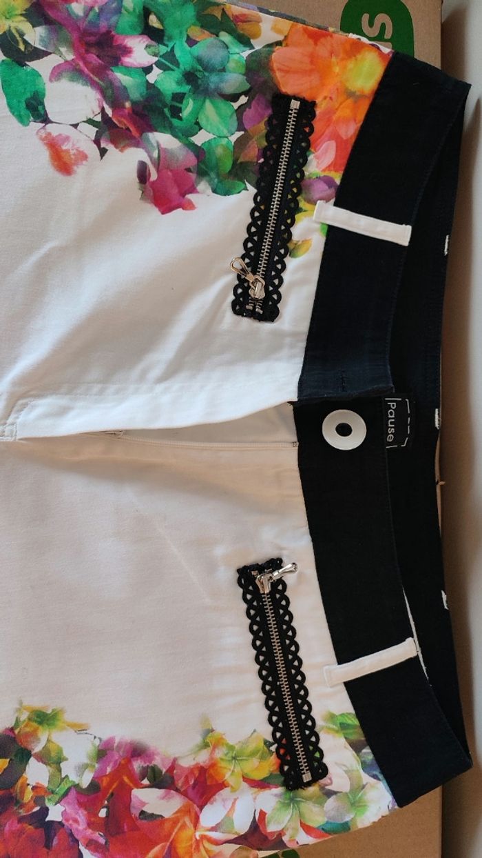 Excellent état, très peu porté. Blanc avec imprimé fleuri coloré Zips au niveau des poches et en bas de jambe. Idéal printemps/été. Marque Pause Café