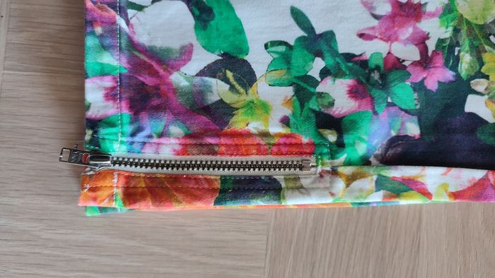 Excellent état, très peu porté. Blanc avec imprimé fleuri coloré Zips au niveau des poches et en bas de jambe. Idéal printemps/été.