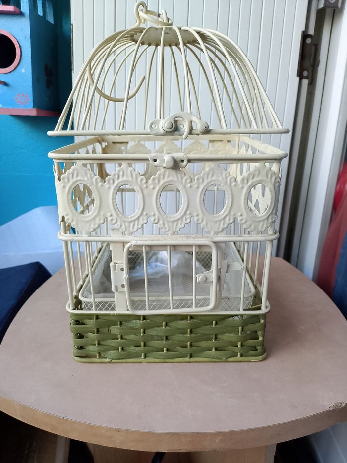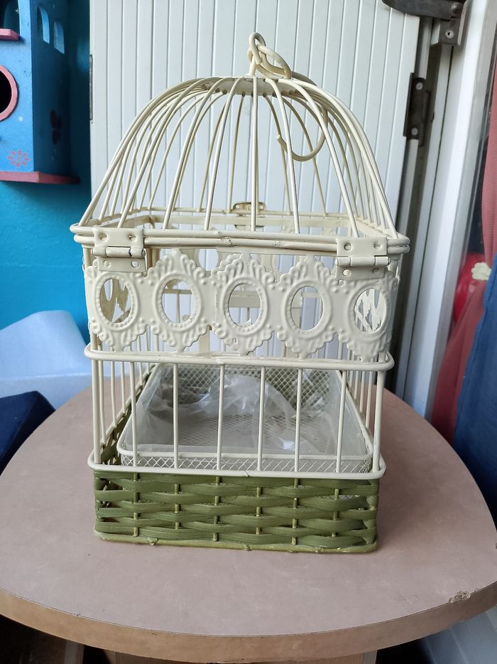 Jolie cage à oiseaux métallique Avec osier Panier (fond) détachable Neuf Hauteur 31 cm / avec suspension 40 cm