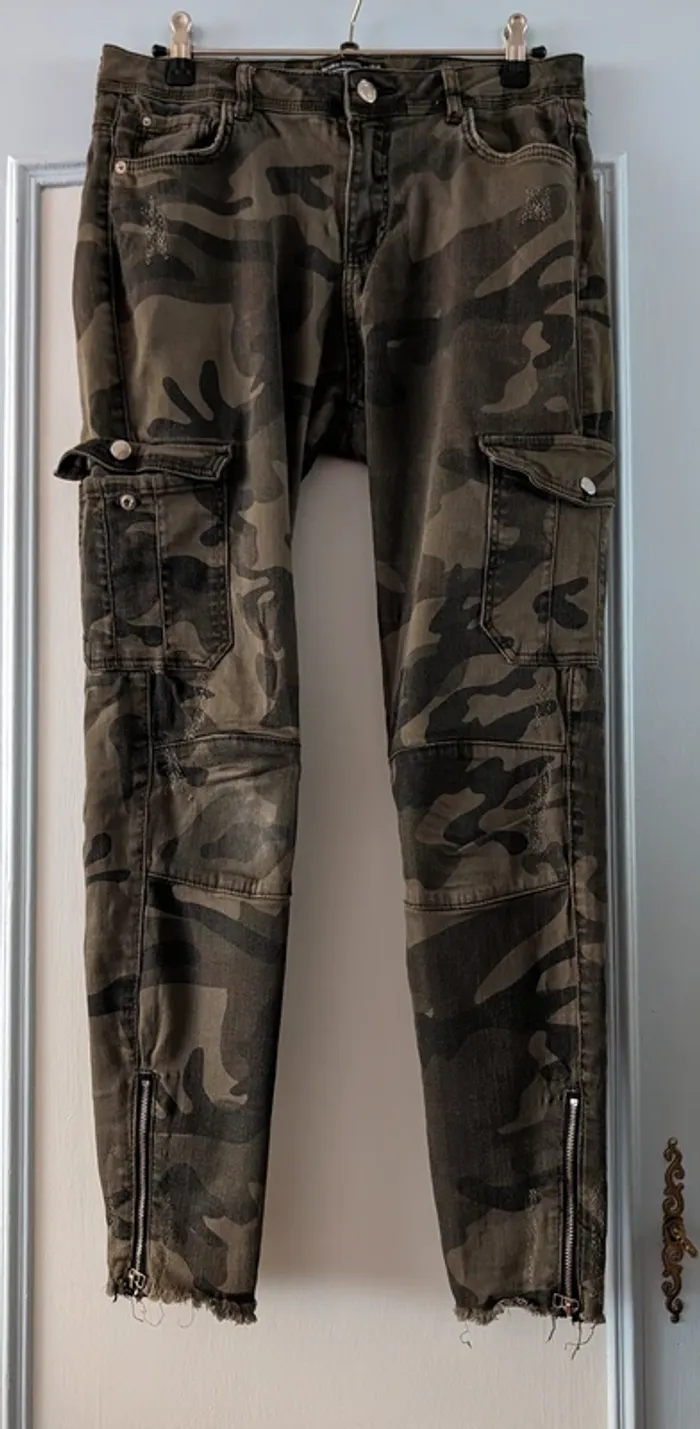 Pantalon de marque Bershka, taille 40. Imprimé militaire, cargo, 5 poches avant, 2 poches arrière, passant pour ceinture. Mesure taille: 37cm Entrejambe: 65cm Longueur: 97cm
