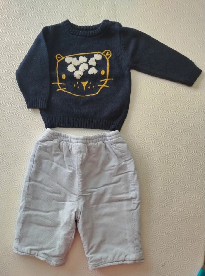 Tenue taille 3 mois composée d'un pantalon chaud bleu clair de la marque L'enfant Do ainsi que d'un pull bleu marine à motif tigre / léopard de la marque Grain de blé. Très bon état général, pull acheté neuf en magasin. N'hésitez pas à me contacter pour toute question et à faire des lots, réductions activées ☺️ #lenfantdo #lenfantdo3mois #graindeblé #graindeblé3mois #tenue3mois #ensemble3mois #tigre #leopard #pull3mois #pantalon3mois