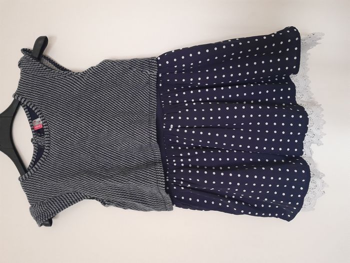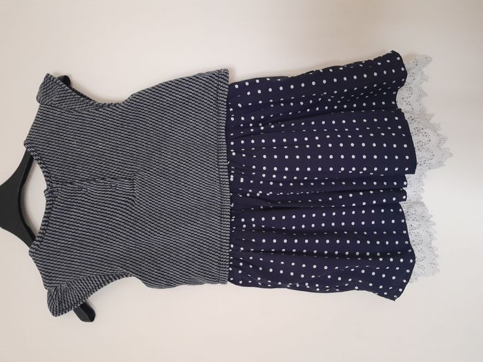 Robe à pois sur le bas avec dentelle, rayé sur le haut, doublé, attache bouton au dos Matière : 100 % Coton