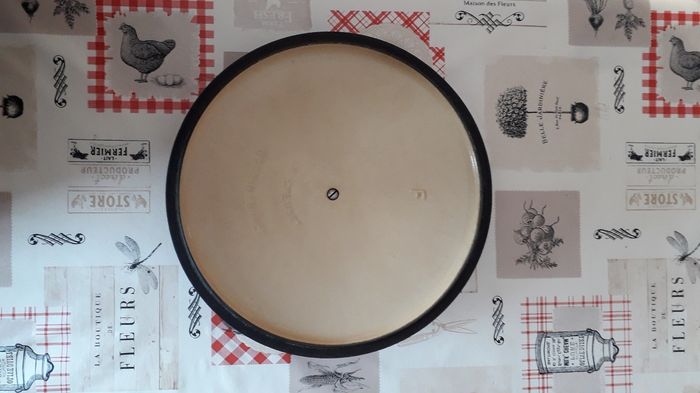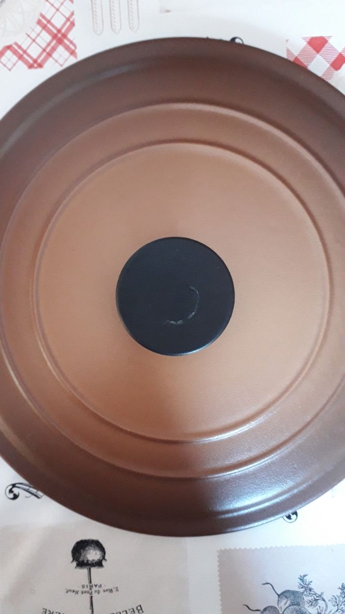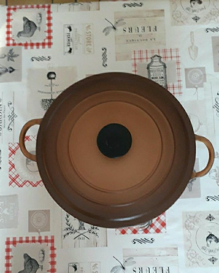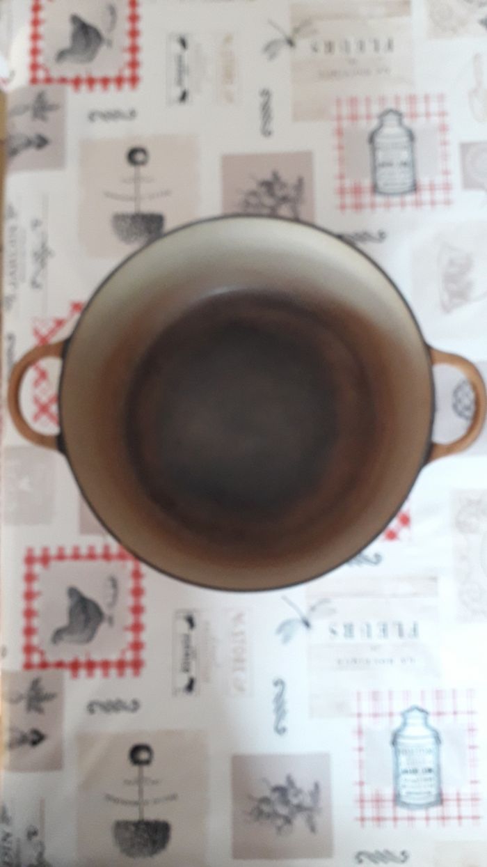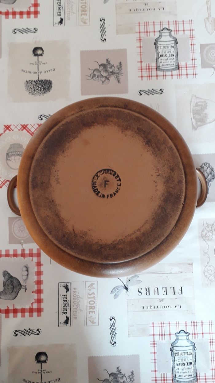 Cocotte ronde en fonte le Creuset diamètre 25 cm bon état général légères ébréchures sur le côté du couvercle