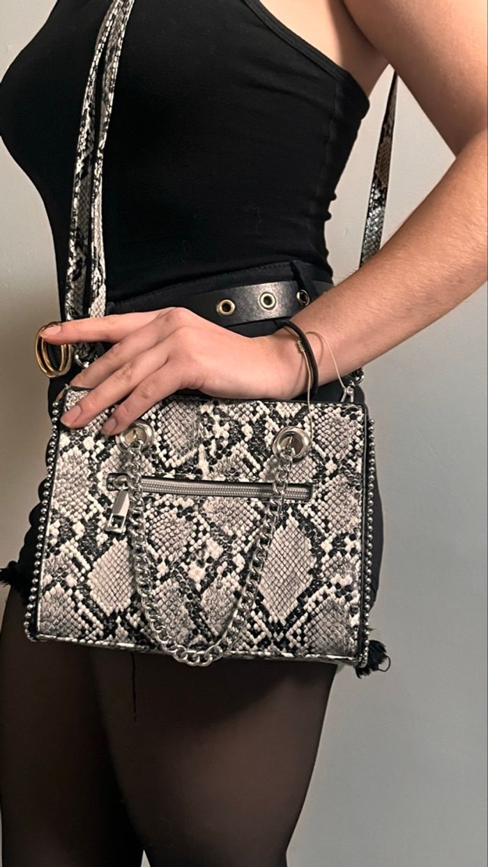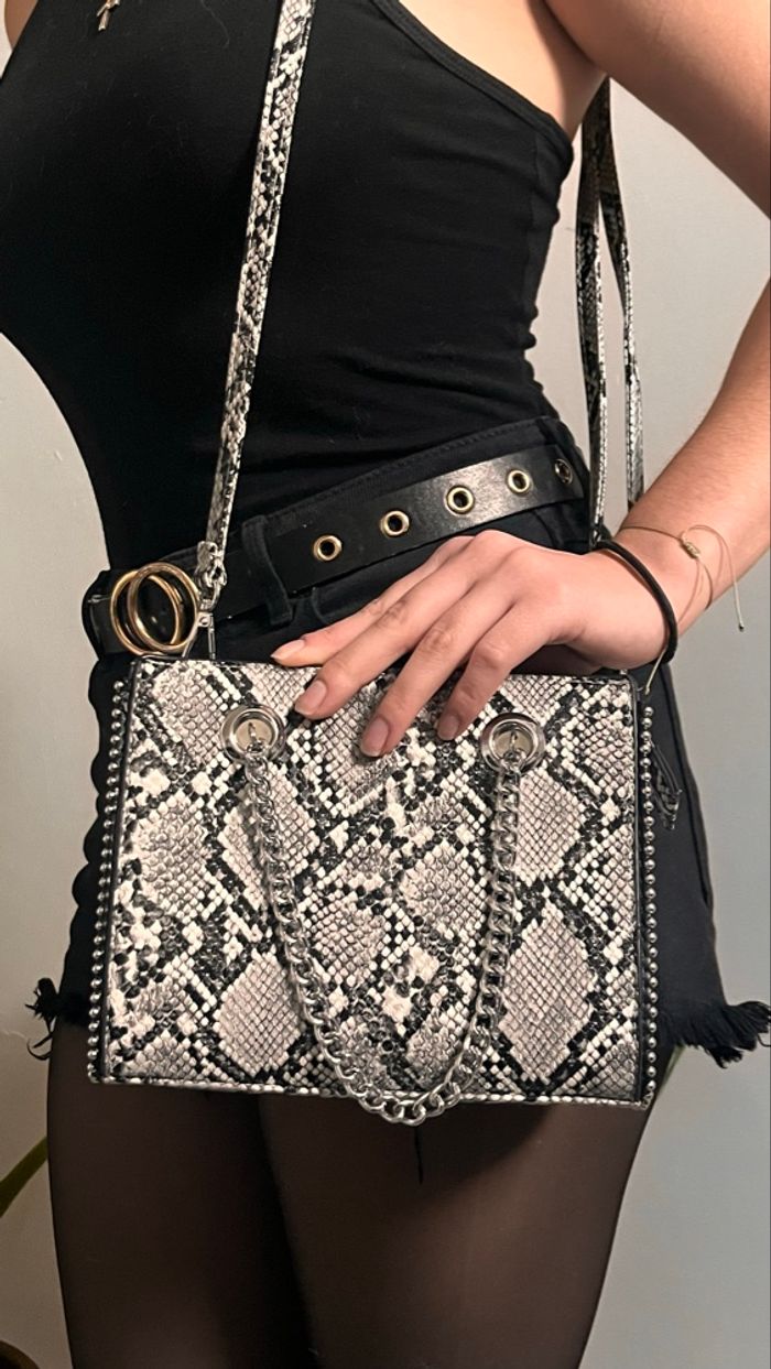 Sac à bandoulière effet peau de crocodile, noir et gris , en très bon état. La marque n’est pas renseignée , la marque mise en description est donc aléatoire.