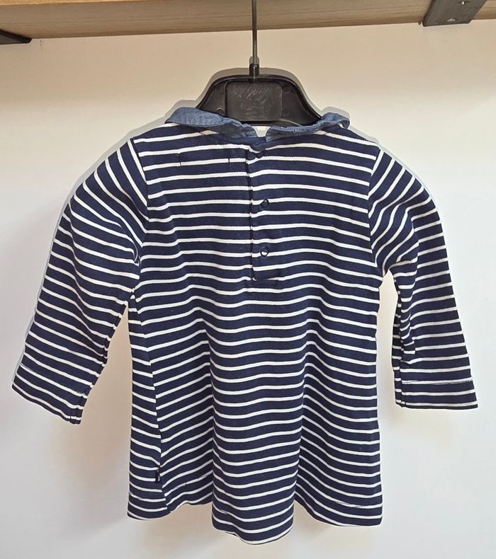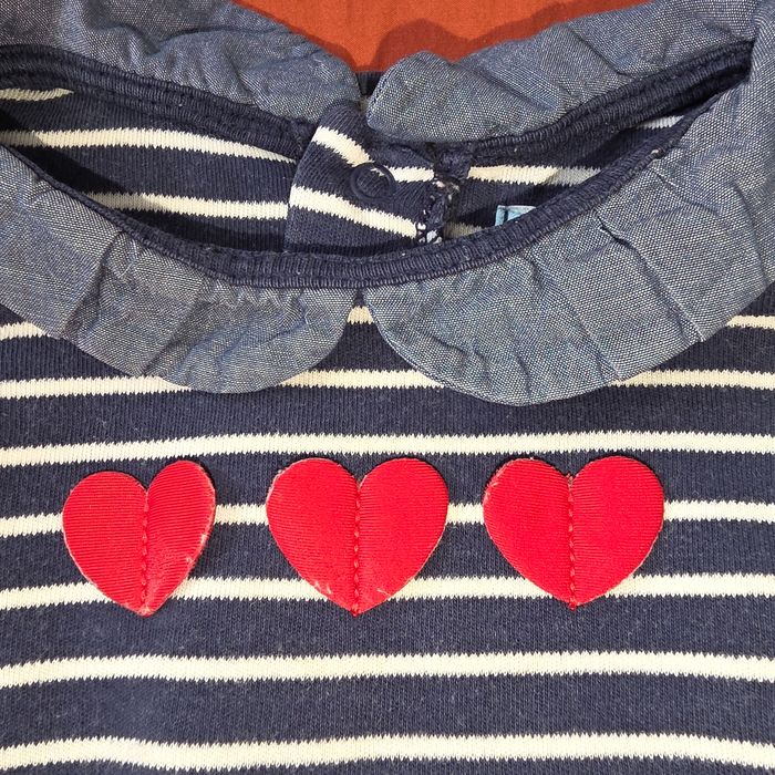 Robe a manche longue blanc rayé bleu marine, avec 3 petit cœurs sur la poitrine. Marque obaïbi en 12 mois. Cœurs légèrement usés ( voir photos). Remises sur lots activé ✅️ De plus, moins de frais de livraison 🪙📦 Envois rapide et soigné ! 🚚