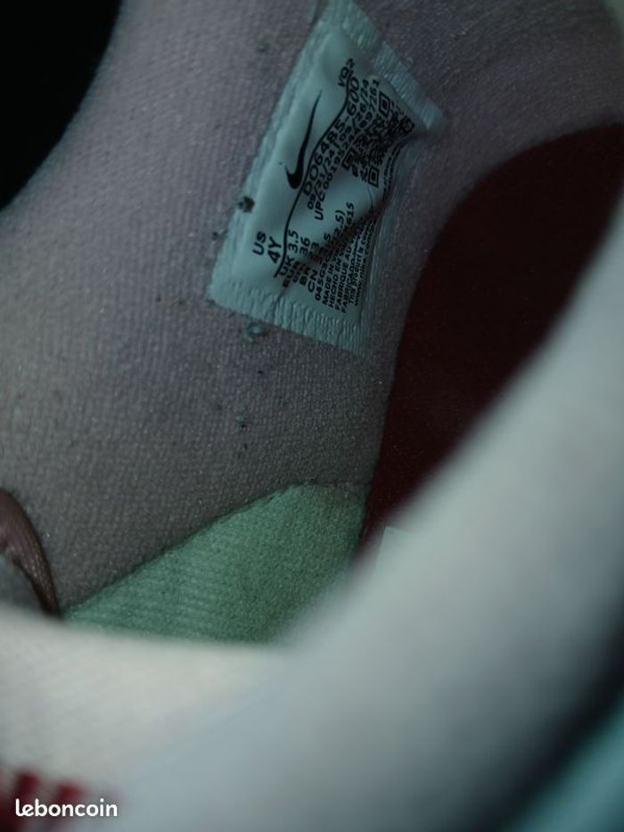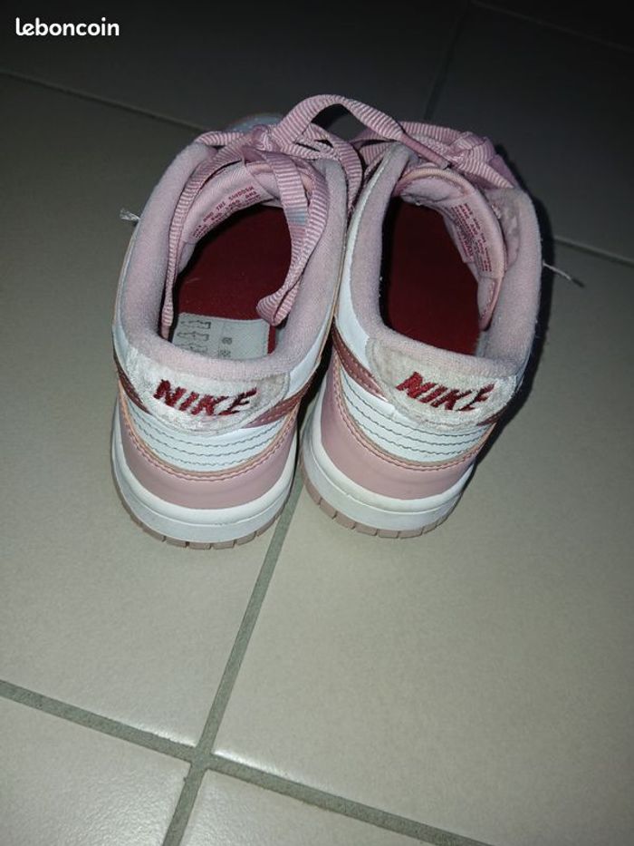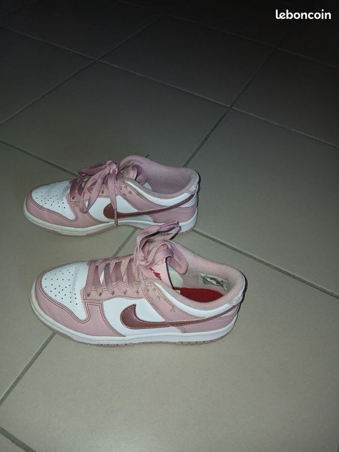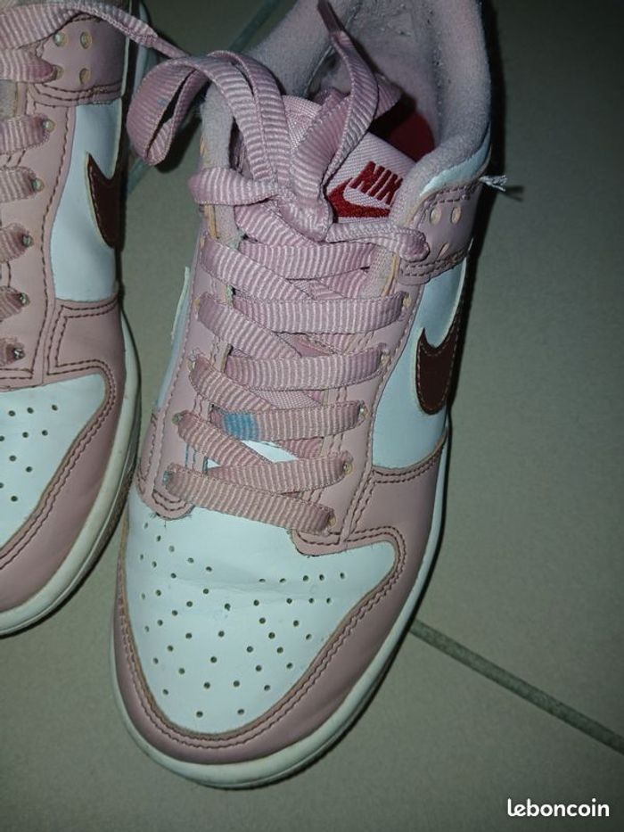 Vends une paire de baskets en cuir à lacets, marque Nike Dunk low, couleur rose velvet, pointure 36. Longueur pied 24 cm. Très peu servies, achetées fin 2025 mais déjà trop petites. A noter : il y a juste une trace de peinture bleue sur un lacet que je n'ai pas réussi à enlever. Il faudrait soit tourner le lacet soit en mettre de nouveaux.