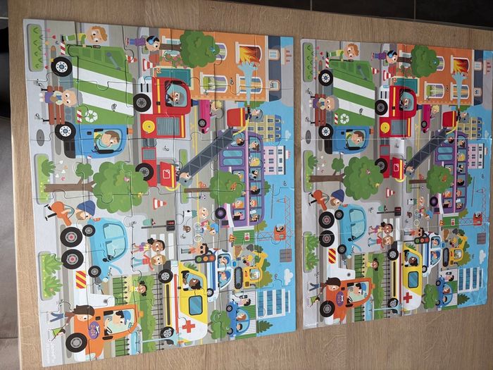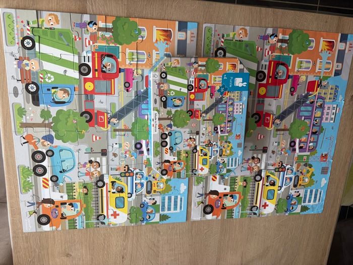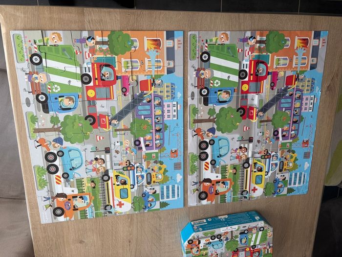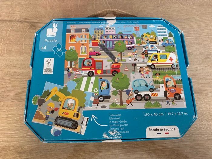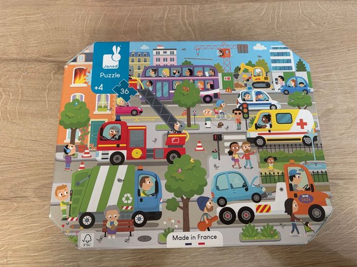 En très bon état et complet. Boîte un peu abîmée avec le scotch d’ouverture et poster avec un mini trou mais rien de méchant (voir avant dernière et dernière photo) Avec ce puzzle en carton, votre enfant découvrira la ville et son animation ambiante tout en développant sa dextérité et sa concentration. Dans sa jolie valisette, ce puzzle sera facile à transporter grâce à sa poignée en tissu. Contient un poster servant de modèle. Nombre de pièces : 36 Fabriqué en France, à base d'encres végétales.