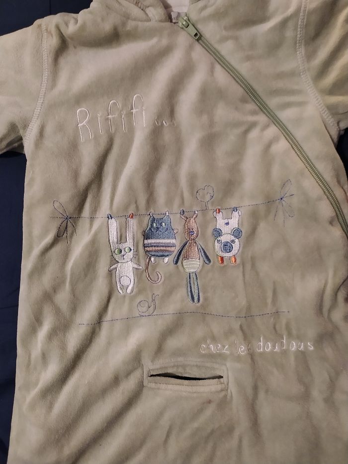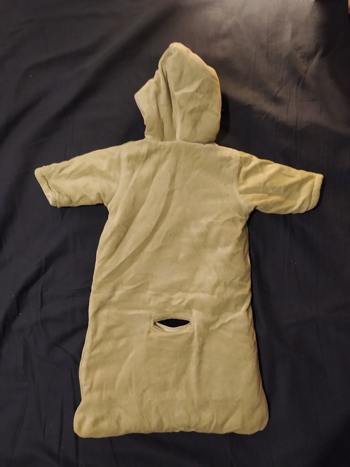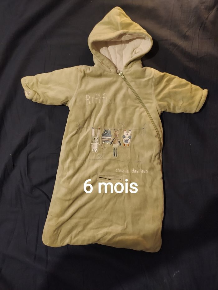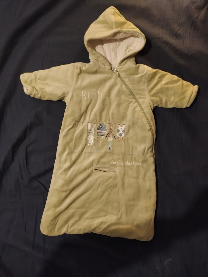 Chancelière Verte taille: 6 mois longueur épaule à en bas: 63 cm couleur: vert/kaki pale avec broderie animaux, marque: In Extenso de Auchan, ouverture pour passage attache poussette ou siège auto, 1 grande ferme éclair de biais, capuche, en coton et polyester, 2 tâches propres (voir ronds oranges, ne se voit pas quand porté car dans le pli du cou), Bon état (taches voir ronds oranges)