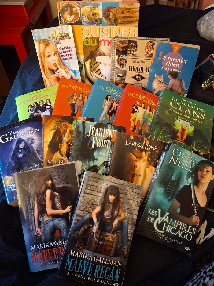 Livre à l'unité 5 euros très bon état 16 disponibles - Les sœurs de la lune tome 1 et 2 - La fille du soleil noir tome 1 - Les cavaliers de l'apocalypse tome 1 - Au bord de la tombe tome 1 - Les vampires de Chicago tome 1 - Maeve regan tome 1 - Maeve regan tome 2 - La guerre des clans cycle 1 - Cuisines du monde - Plaisirs au chocolat - Hannah Montana tome 1 - Le premier chien - Les menteuses tome 2 - Les menteuses tome 3 - Les menteuses tome 4 - Les menteuses tome 5