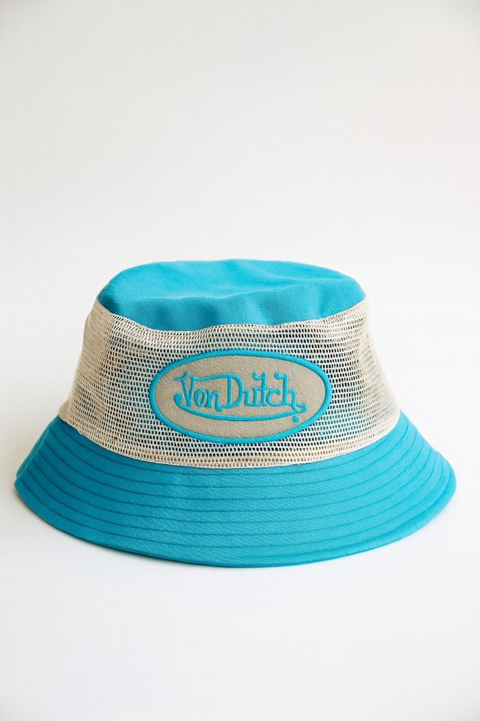 Bob Von Dutch original, coloris turquoise avec bande centrale en mesh doré métallisé. Logo brodé à l’avant en turquoise sur fond doré. Tissu coton sur le haut et le bord, effet brillant sur la bande centrale. Taille unique, coupe bucket classique. Pièce tendance au style Y2K, parfaite pour un look streetwear ou festival
