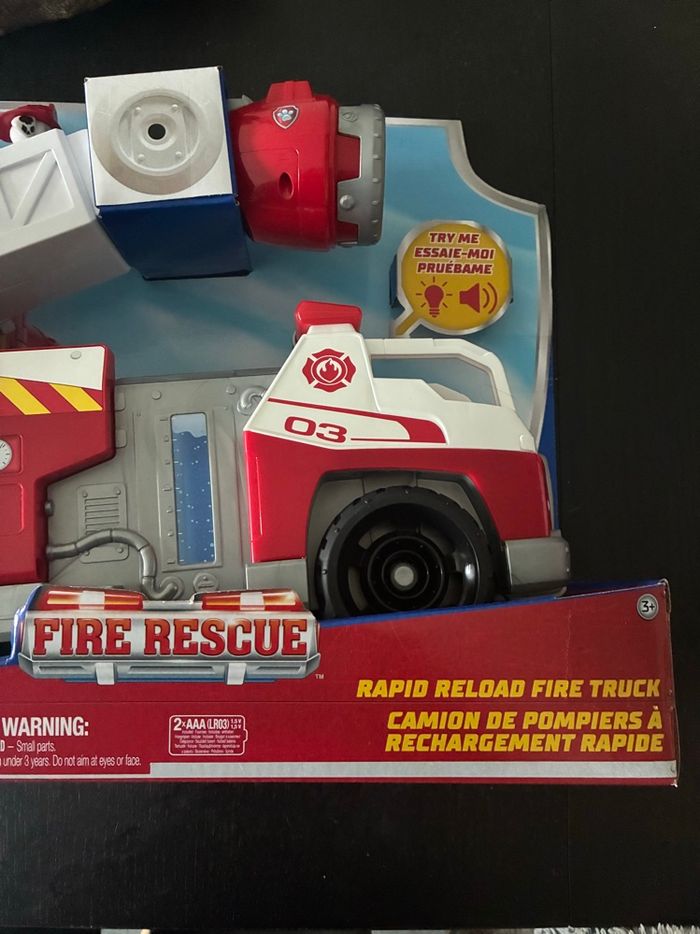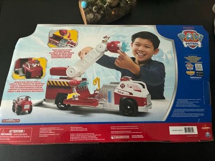 Neuf complet non ouvert carton d’origine scellé version de luxe Camion de pompier à rechargement rapide PAW PATROL Au feu, les pompiers ! Vite, le camion de pompier deluxe et figurine Marcus - Fire Rescue La Pat Patrouille de Spin Master part en mission d'intervention. Heureusement, il est équipé d'un canon à eau lance-projectiles. Ouf, l'intervention se passe bien et tout le monde est sain et sauf. Tout ça grâce à l'imagination débordante de votre enfant. Camion de pompiers à rechargement rapide. pour tenir compagnie a stella, chase, ruben, rocky, Zuma, tracker, everest paw patrol