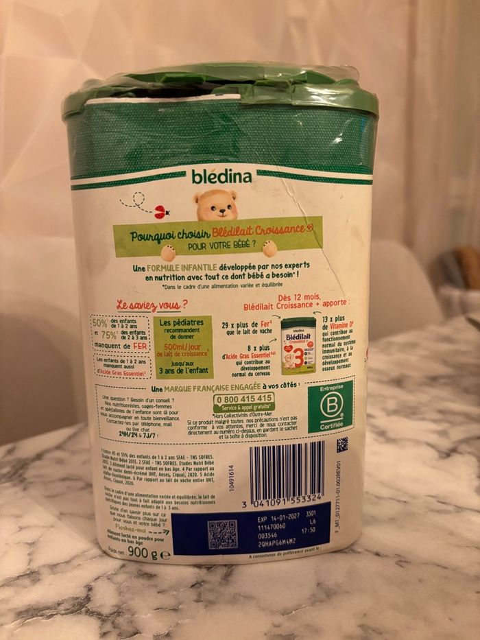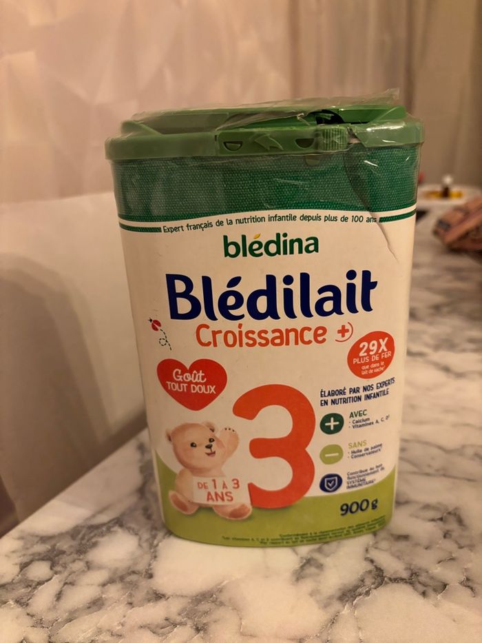 1 boîte de lait de croissance (3ᵉ âge) à vendre. Le lait est neuf. Le couvercle extérieur est cassé/fissuré, mais l’opercule intérieur de sécurité est intact. Le produit n’a jamais été ouvert ni utilisé. Boîtes propres et bien conservées. Convient aux bébés de 12 à 36 mois. Date de péremption : 14-01-2027