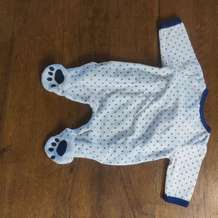 Pyjama en velours avec ouverture devant. Motif ourson et détails patte d'ours sur les pieds. Taille 1 mois (petit). Pressions ok. Maison non fumeur Délais d'envoi