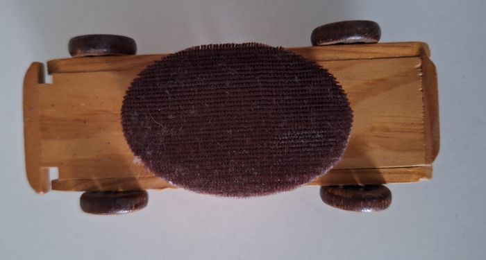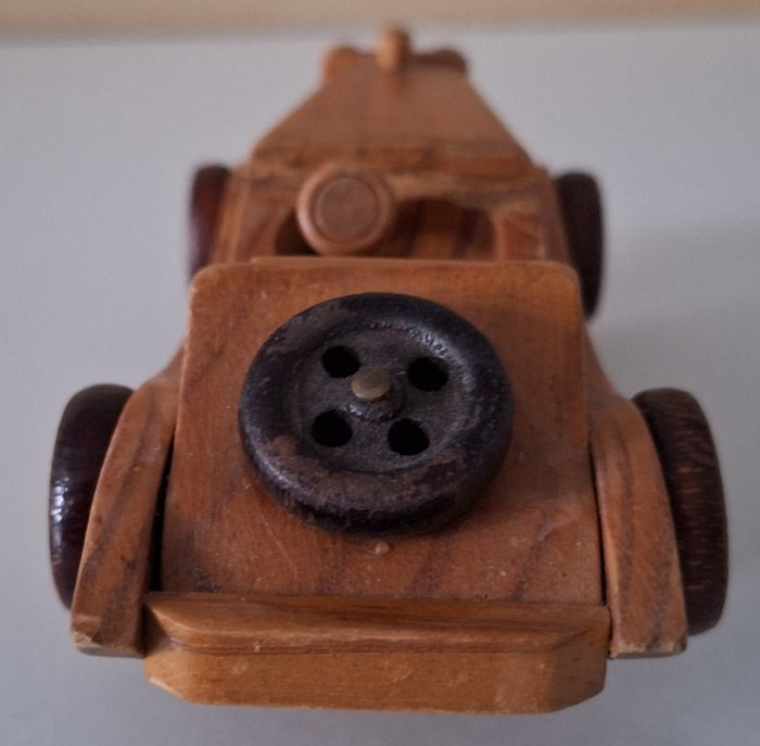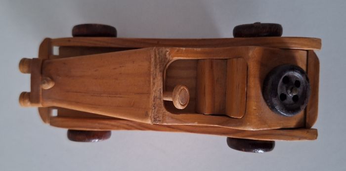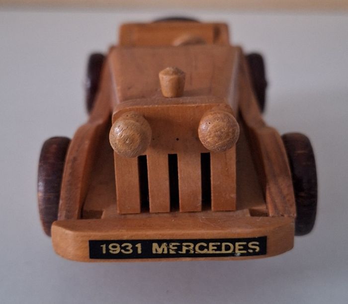 Objet vintage pour les collectionneurs. Mercedes 1931 en bois de longueur 16 cm. Avec brosse en tissu en-dessous. II manque le pare-brise.