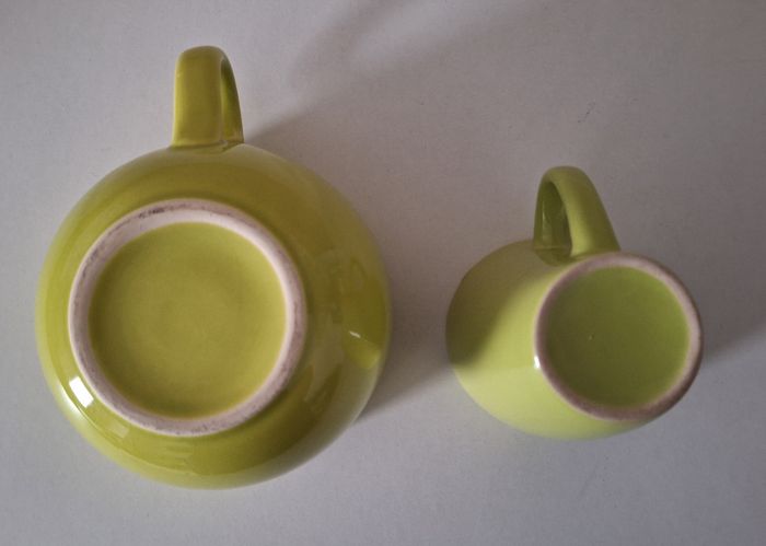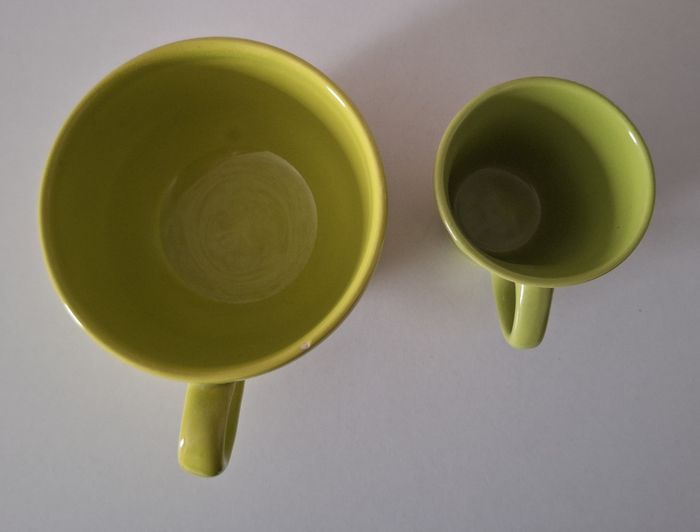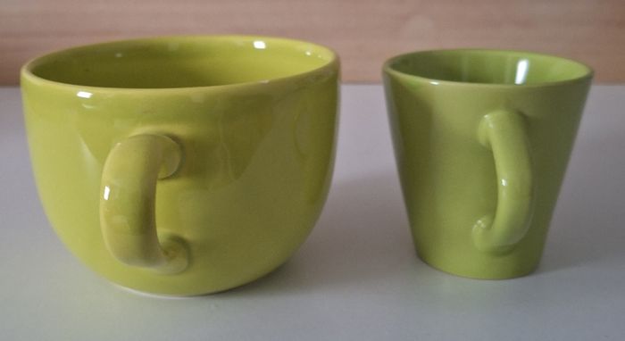 Un bol de hauteur 9 cm et de diamètre 12 cm. Une tasse de hauteur 8 cm et de diamètre 7,5 cm. Tous les deux de couleur vert anis, mais pas tout à fait la même couleur. Un éclat mini sur le bol.
