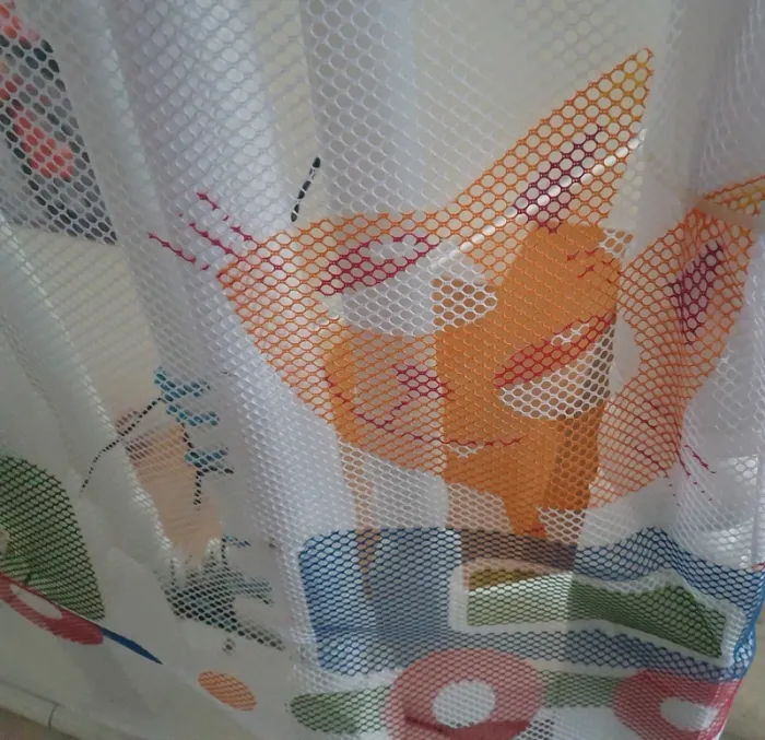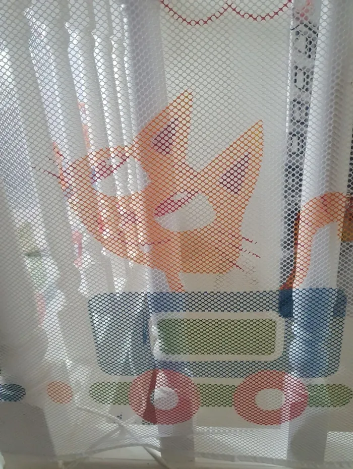 Filet de sécurité enfants pour barrière/rampe d'escalier avec motifs train et animaux. Le filet est blanc et les motifs multicolore. Il est en 3 partis. 1 partis de 300 cm + 1 partie de 147 cm + 1 partis pour la porte de 152 cm sur 78 cm de haut. La partis du filet du portillon a été coupé sur un côté pour obtenir la longueur. En super état. Peu être laver en machine. Les attaches serflex blanc seront à acheter à part ils en faut environ 20 pour en haut et 20 pour le bas car ceux que j'ai utilisé seront coupé pour décrocher le filet. Voir toutes les photos. Utilisé plusieurs mois mais reste en super état, n'y tâches, n'y déchirures.