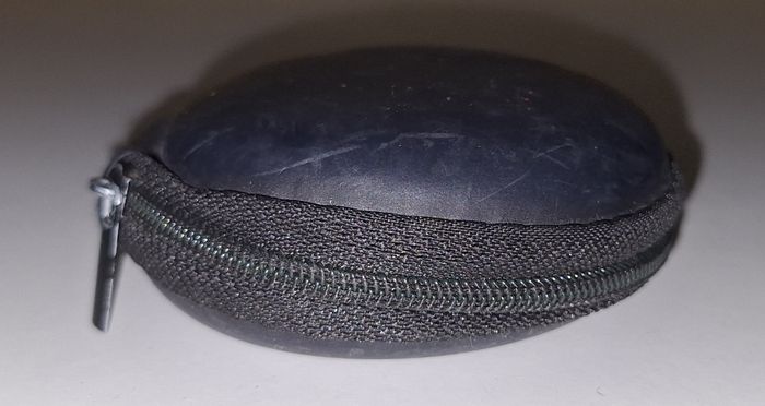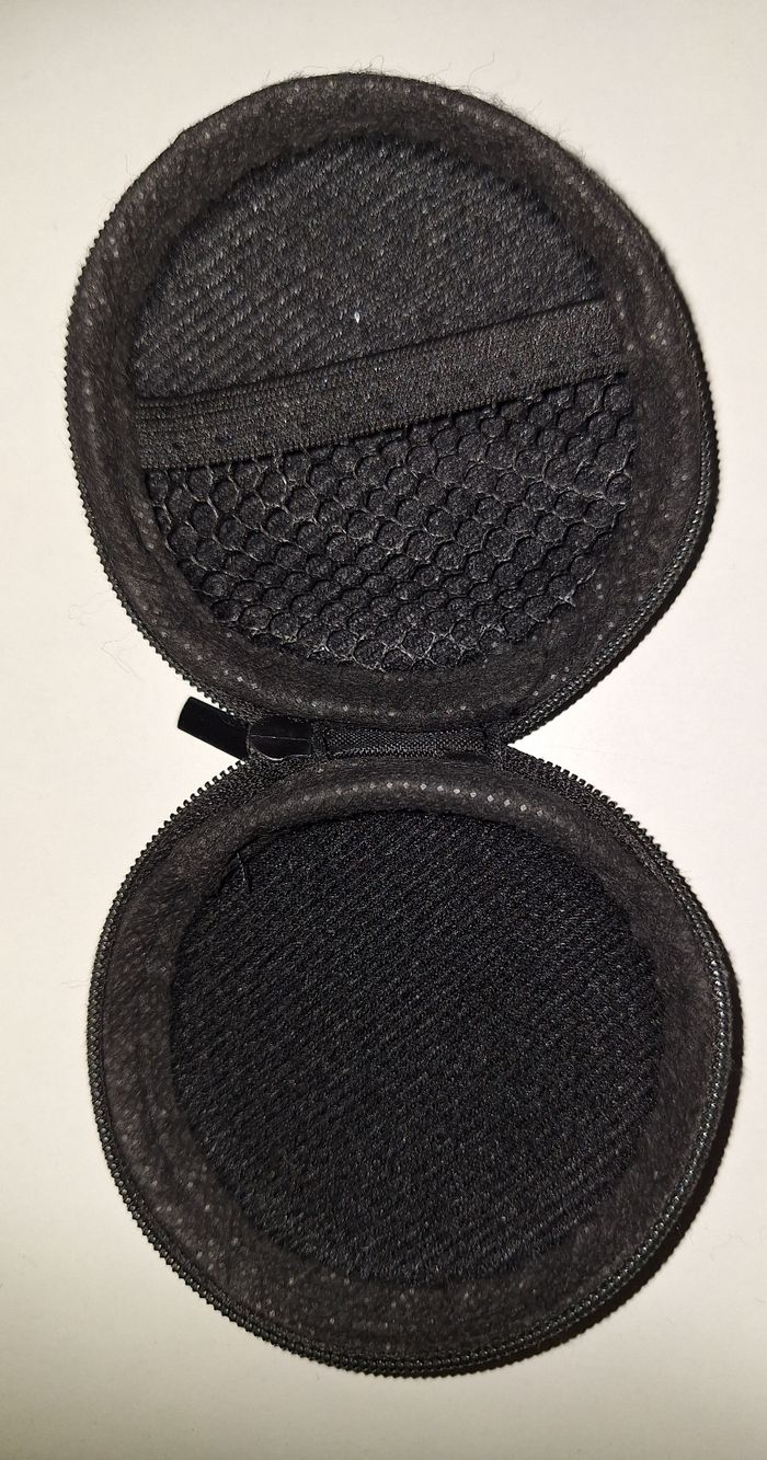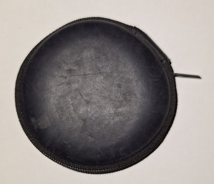 Etui rond zippé pour ranger vos écouteurs. Diamètre 8 cm. Epaisseur 2,5 cm. Un petit filet à l"intérieur. Extérieur un peu griffé.