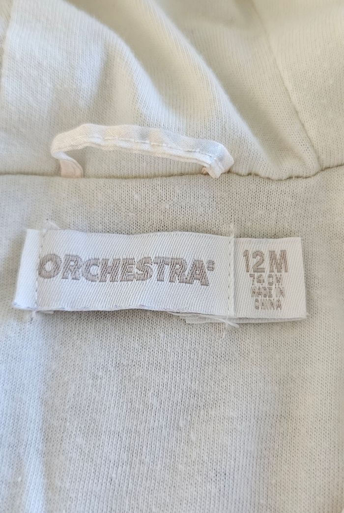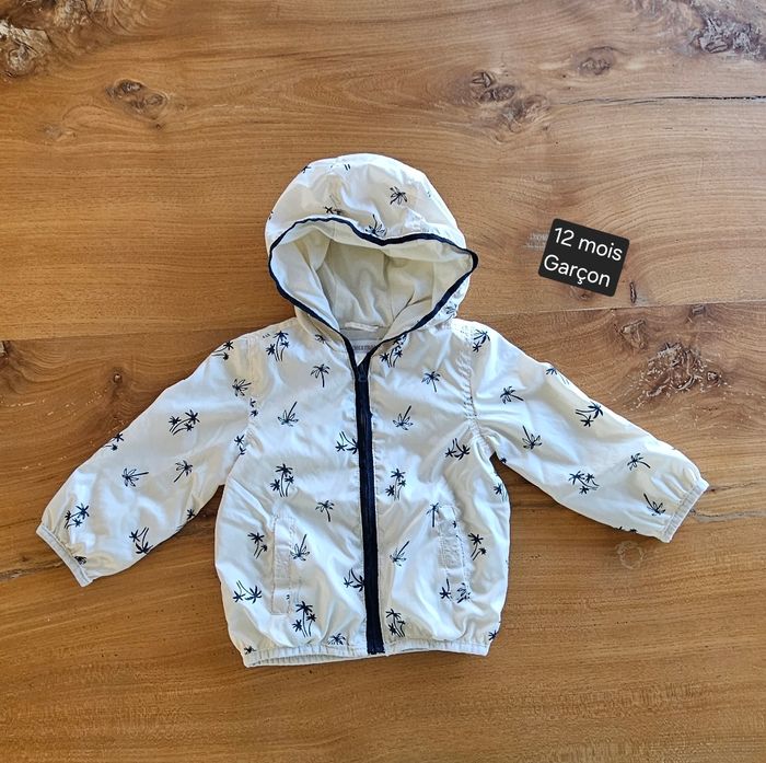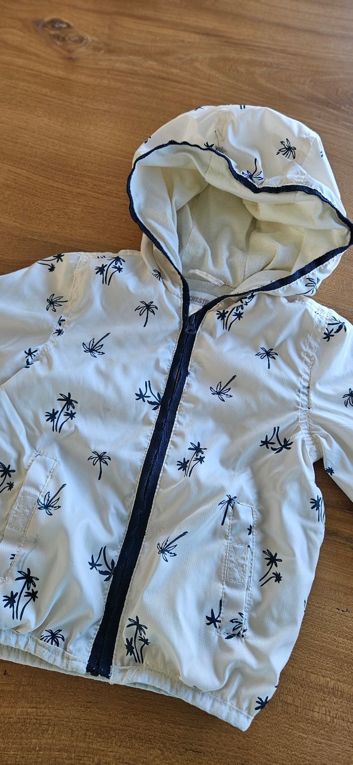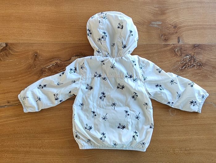 Veste coupe vent à capuche bébé garçon blanche. Dessin de palmier noir imprimé sur l'ensemble de la veste. Poches décoratives sur le devant. Ouverture zippée sur le devant. Porté mais reste en très bon état. Aucune tâche, ni trou 👌