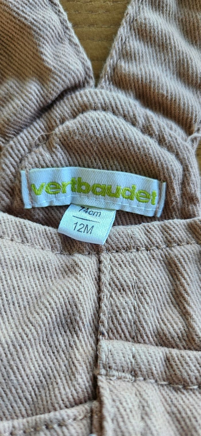 Salopette bébé garçon marron clair. Ouverture pressionnée aux épaules, sur les côtés et à l'entrejambe. Poche décorative sur le devant. Jamais porté donc neuve. Aucune tâche, ni trou 👌