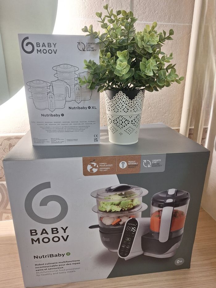 Robot culinaire pour bébé (mixeur et robot cuiseur vapeur) Marque Babymoov, modèle Nutribaby+ gris anthracite Fonctionne parfaitement pour tous les modes Vient d'être détartré Utilisés quelques fois pour faire les repas de mon bébé mais je suis passée aux petits pots n'ayant plus le temps En bon état mais le plastique est abîmé sur les 2 paniers vapeur et quelques rayures (voir photos) ainsi que des rayures sur le mixeur (voir photos également)