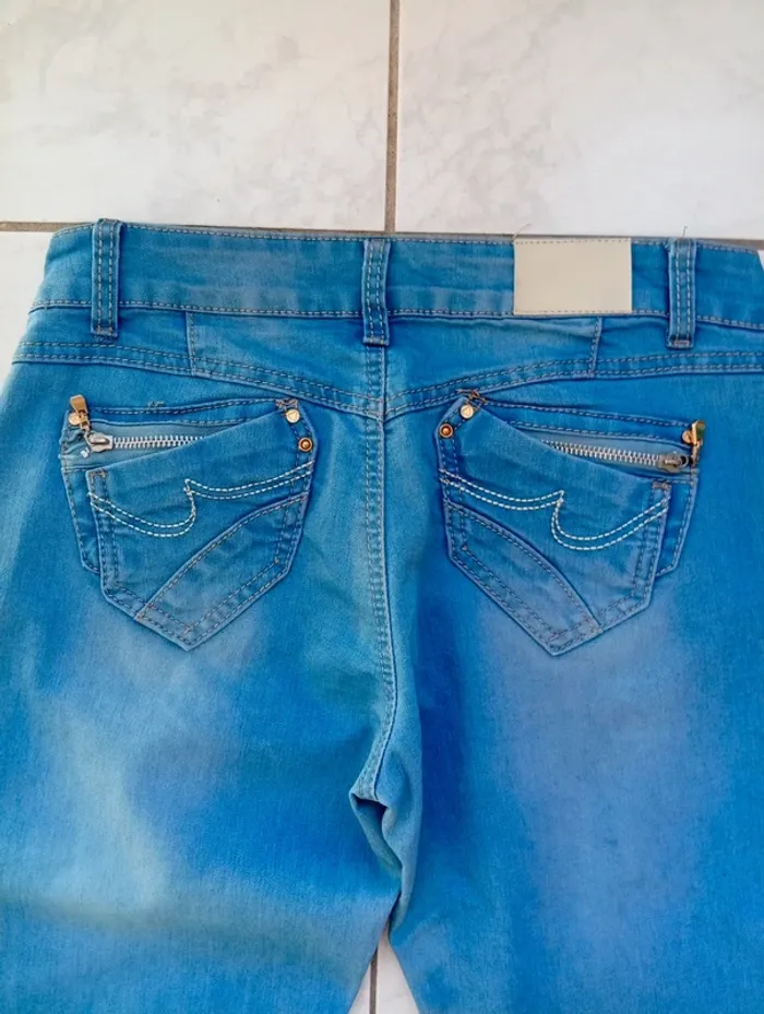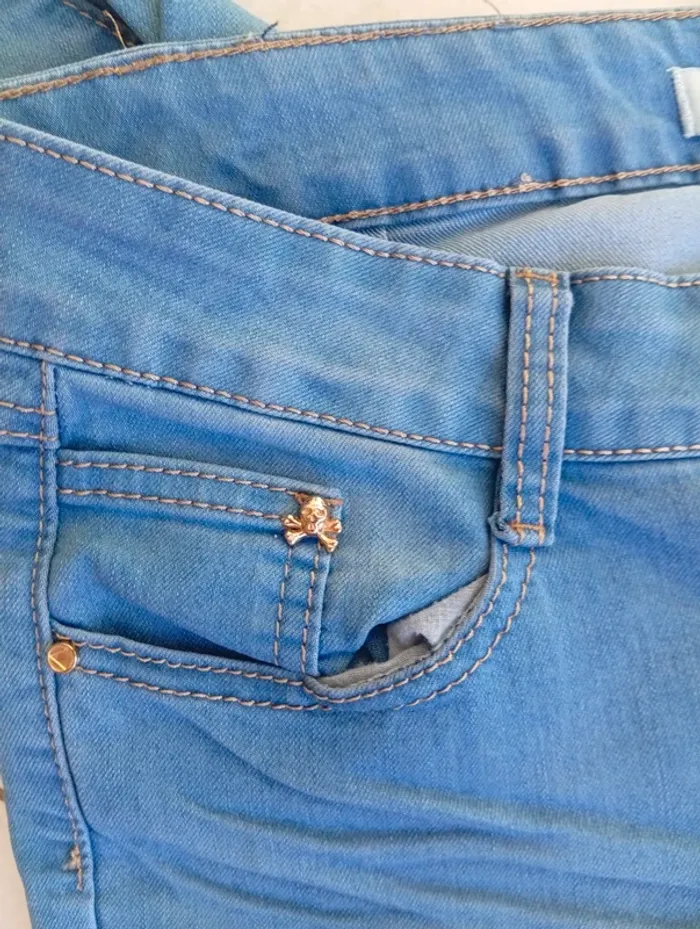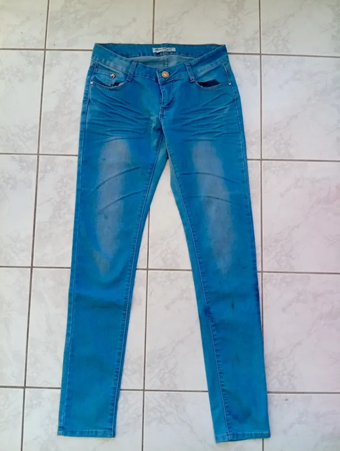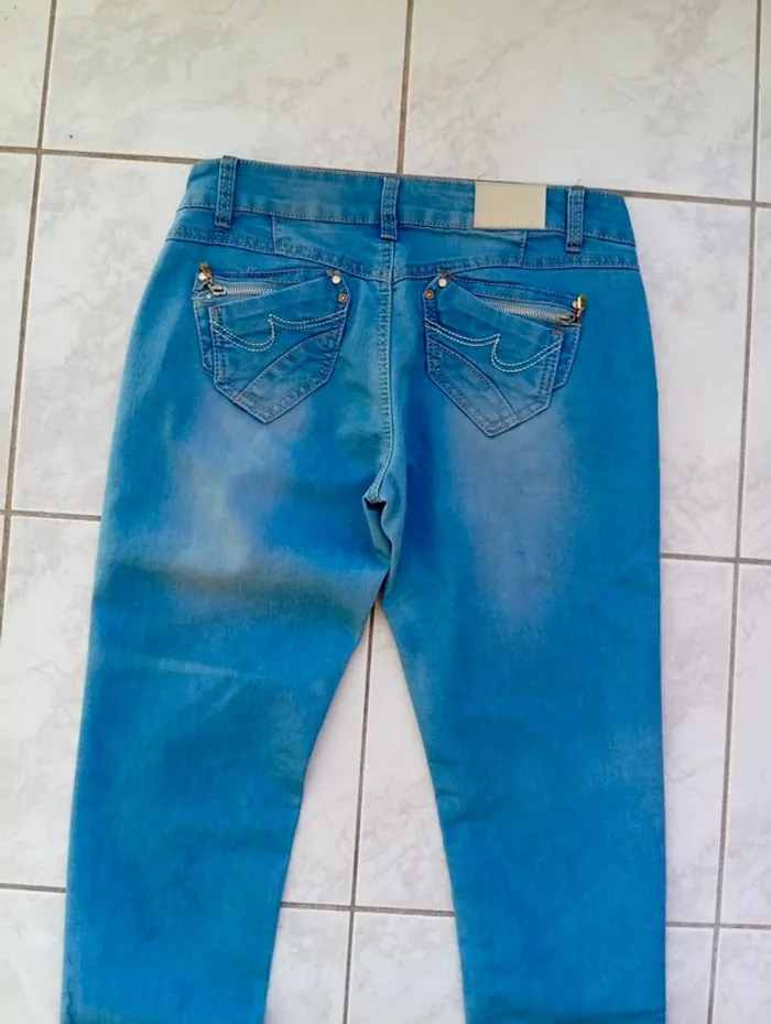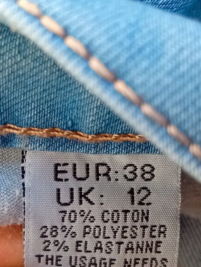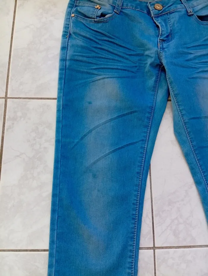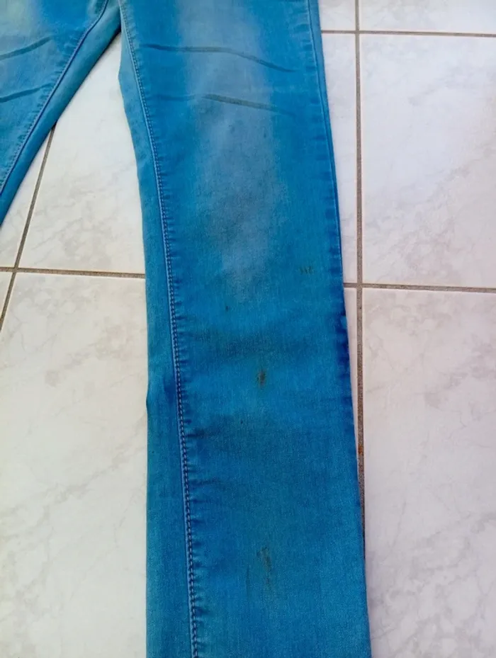 Jean taille 38 ,70% coton 28% polyester 2% élasthanne. tache sur la jambe que je n'ai pas réussie a faire partir j'ai pensée le teindre en bleu foncé mais je n'ai pas eu le temps , le tissu n'est pas abimé .