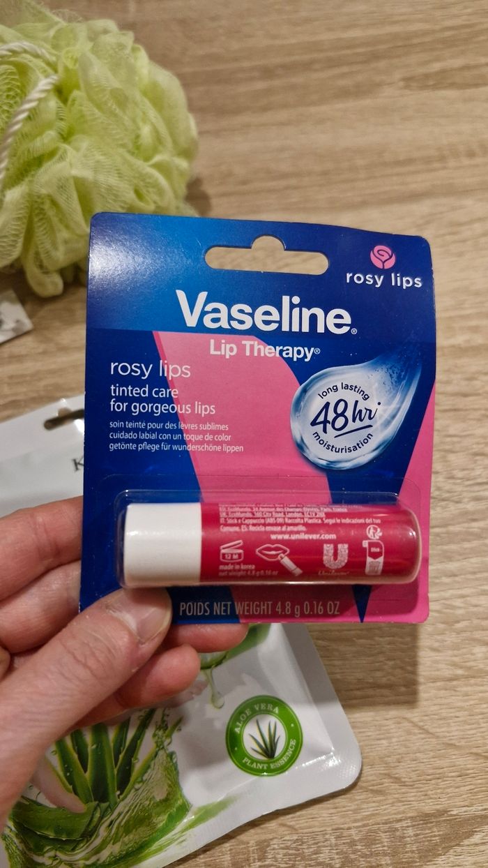 Lot beauté neuf composé de : - une paire de masques beauté hydratants pour les pieds, - une fleur de douche vert clair Yves Rocher, - un baume à lèvres Vaseline soin teinté rose pour 48h d'hydratation,