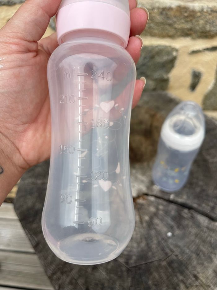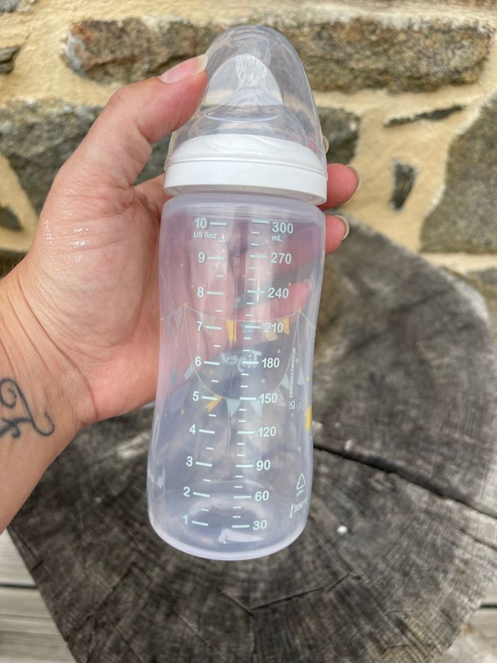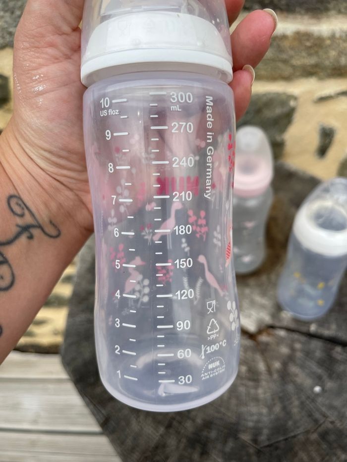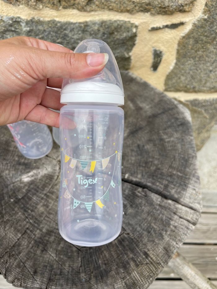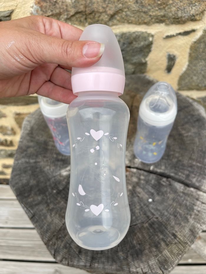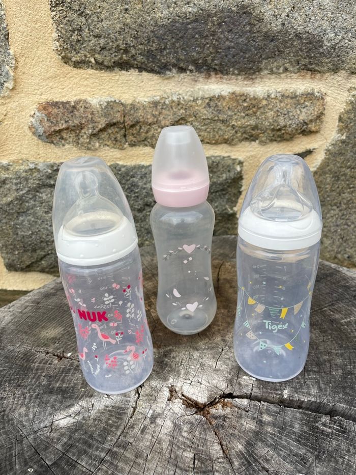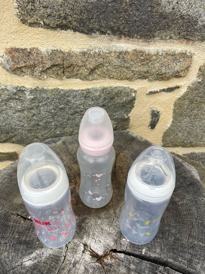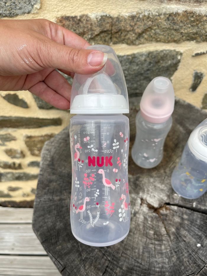 Lot de 3 biberons - Un nuk dans les tons rose flamand rose - 300ml (neuf) - Un Tigex fanion jaune - 300ml (neuf) - Un rose avec lapin - 240ml
