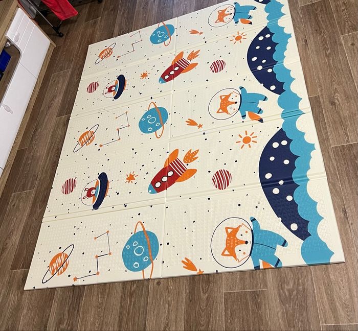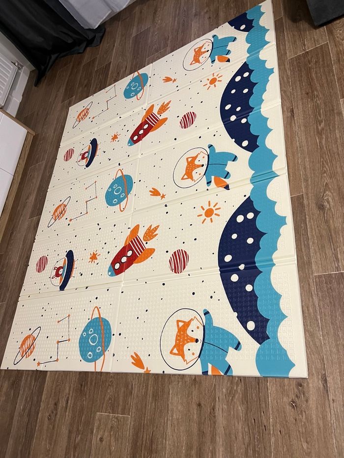 Magnifique tapis de jeu réversible pour bébé, neuf dans son emballage. Très léger et pratique, il se plie facilement et se range sans prendre de place. Avec ses dimensions 150 x 180 x 1 cm, il offre un grand espace de jeu confortable et sécurisé pour bébé. Il permet à bébé de jouer tranquillement, même quand le sol est froid. La matière est douce, antidérapante et facile à nettoyer. ✨ Tapis réversible avec deux univers différents : • Face 1 – Thème océan / mer 🐳 : baleine, raie, pieuvre, poissons et crabes, aux couleurs douces et apaisantes. • Face 2 – Thème espace 🚀 : fusées, planètes et adorable renard astronaute, design ludique et coloré. Un tapis vraiment utile, confortable et de belle qualité, parfait pour les moments d’éveil 💛 Très léger, pliable et facile à ranger. ✅ Se nettoie facilement avec un chiffon humide ✅ Parfait pour créer un espace de jeu confortable et sécurisé 📦 Envoi rapide et soigné ✨ Antidérapant – Réversible – Pliable – Waterproof – Zéro produit toxique – Zéro bisphénol A ✨ 📌 Les photos du tapis déplié servent uniquement de modèle de présentation. Le tapis vendu est strictement neuf, dans son carton d’origine, jamais ouvert, jamais utilisé.
