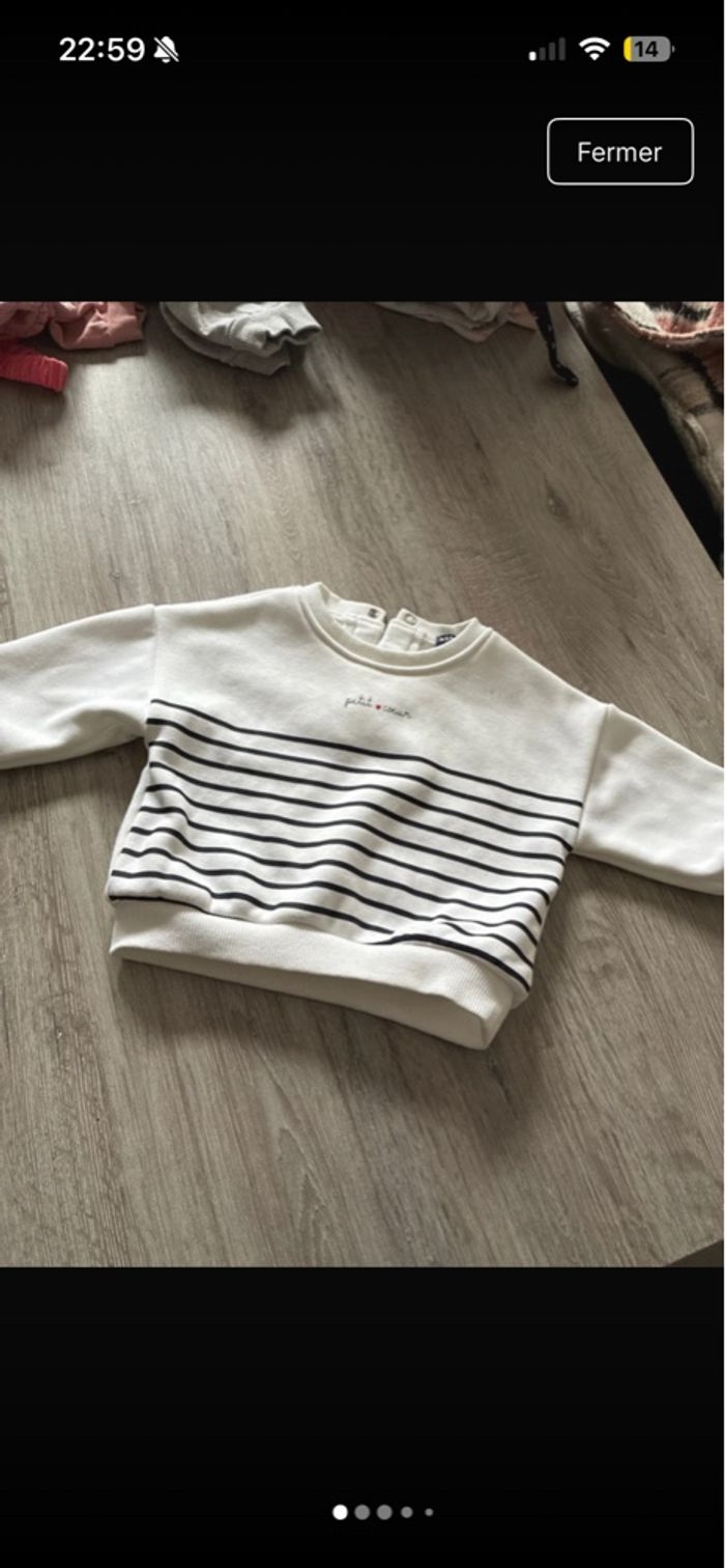 Pull style marinière Porté quelques fois, Encore en bon état contient une tache que je n’ai pas su enlever Le pull est moltone a l’intérieur.