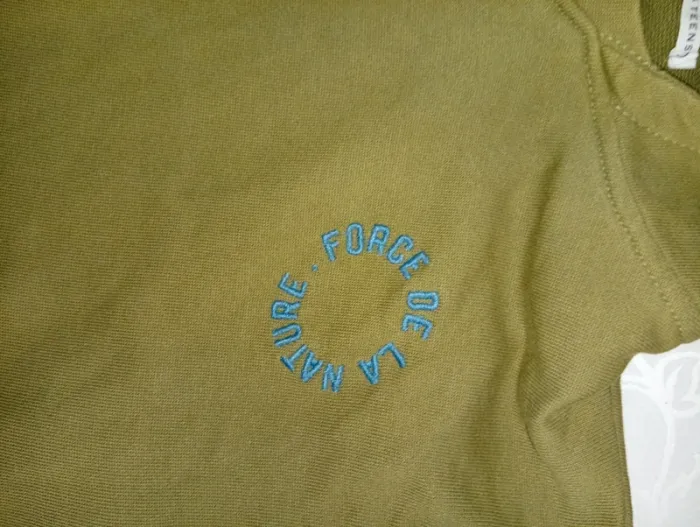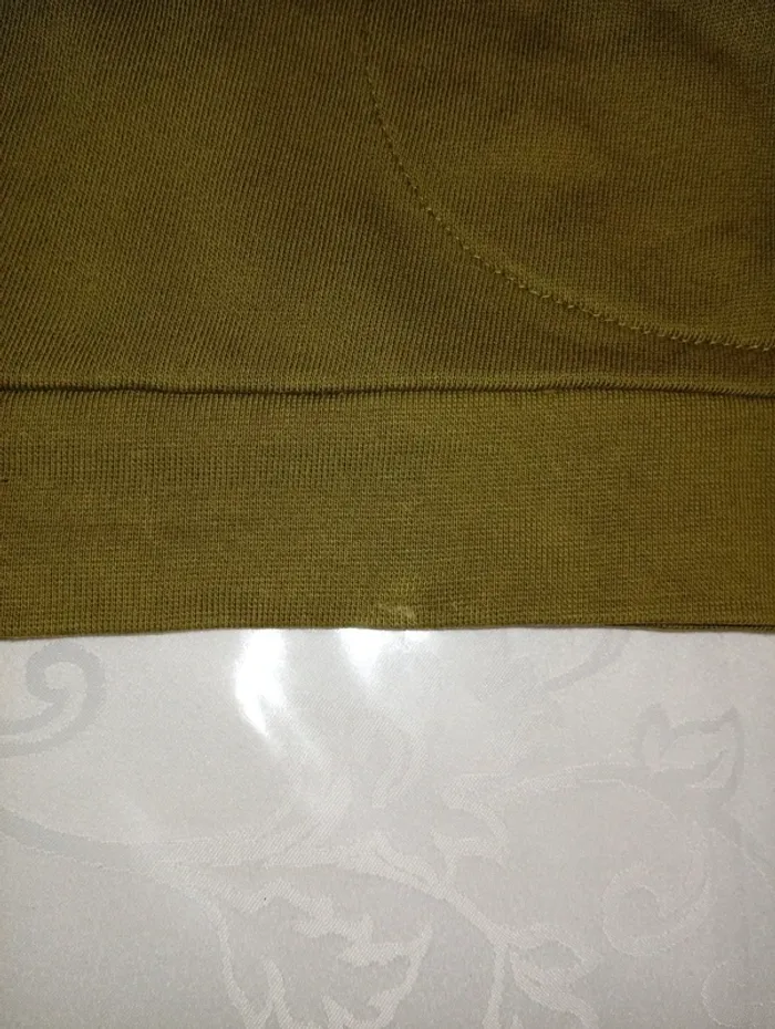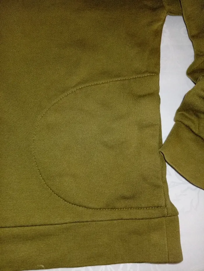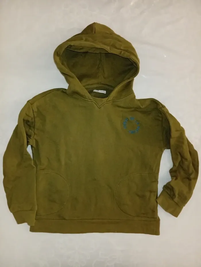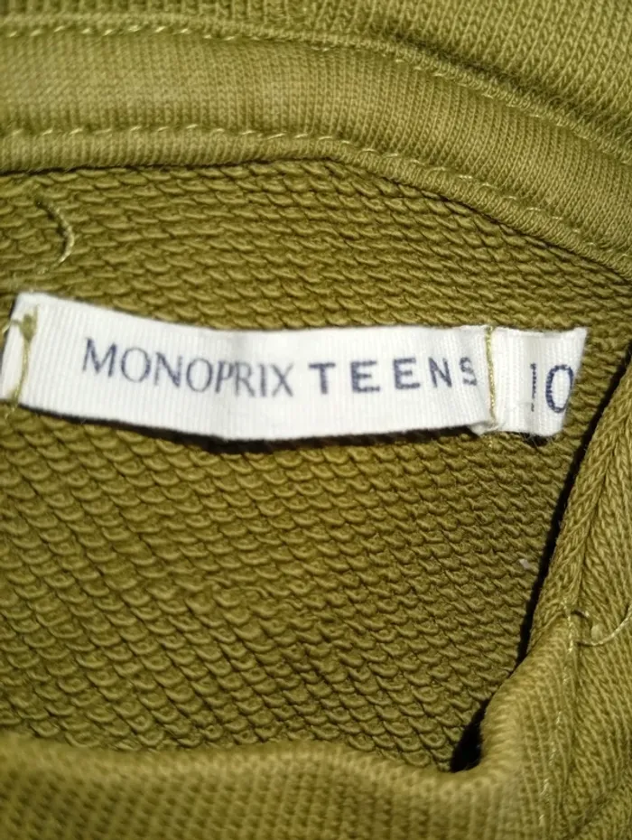 Pull a capuche taille 10 ans mais je trouve que ça taille petit, de chez monoprix ,poches sur les côtés. Légère tâche au bas du pull voir photo a peine perceptible.