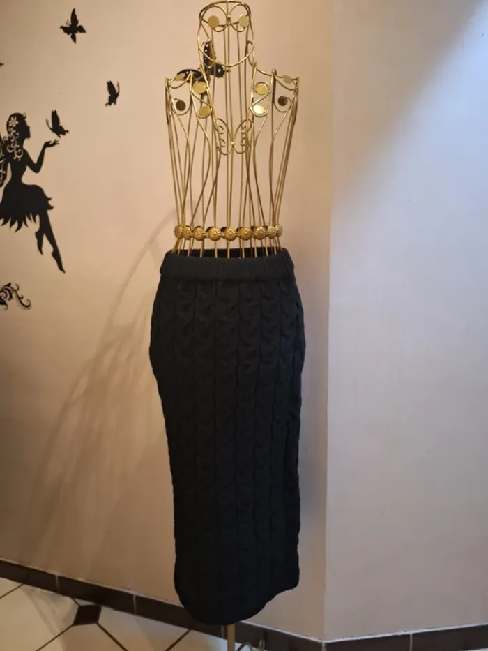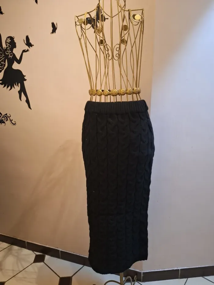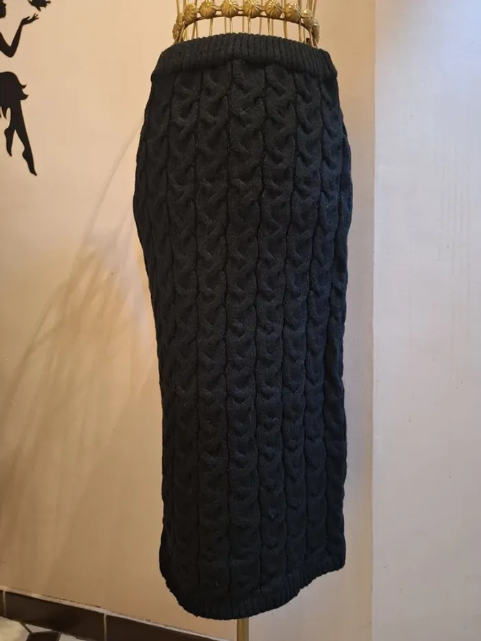 Jupe noir entièrement en mailles torsadées - longueur 75 cm - coupe proche du corps - taille élastique permettant de s'adapter à votre morphologie et de la porter en taille plus ou moins haute - matière très épaisse & très chaude - taille unique idéale pour les tailles M & L ou 38 & 40 - état sans défaut ps: je ne fais pas de photo portée #jupenoire #jupemailles #jupemaillestorsadées